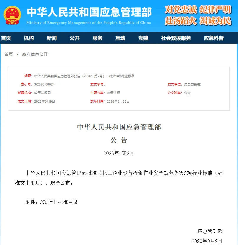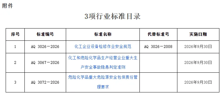 近日,应急管理部发布公告,公布3项行业标准,将于2026年9月30日正式实施。其中包括《化工和危险化学品生产经营企业重大生产安全事故隐患判定准则》(AQ 3067—2026)。