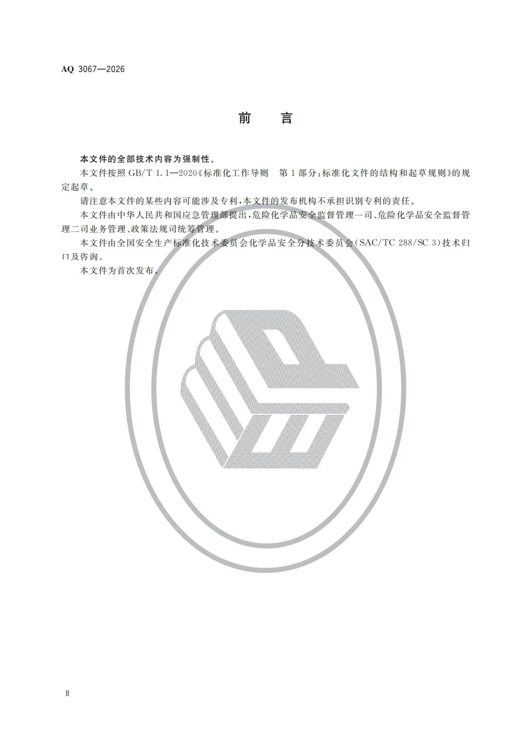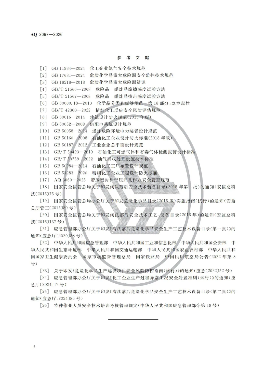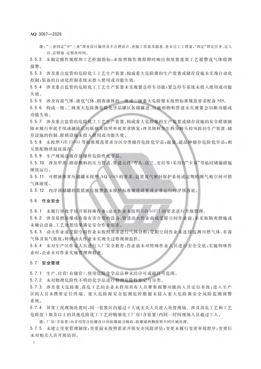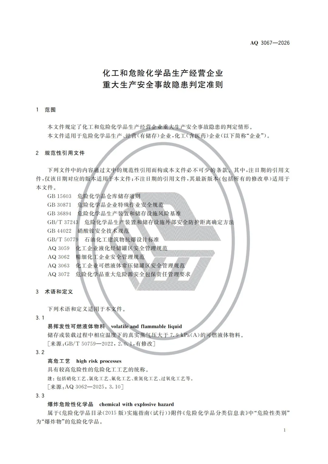 《化工和危险化学品生产经营企业重大生产安全事故隐患判定准则》(AQ 3067—2026)规定了化工和危险化学品生产经营企业重大生产安全事故隐患的判定情形,适用于危险化学品生产、经营(有储存)企业、化工(含医药)企业。