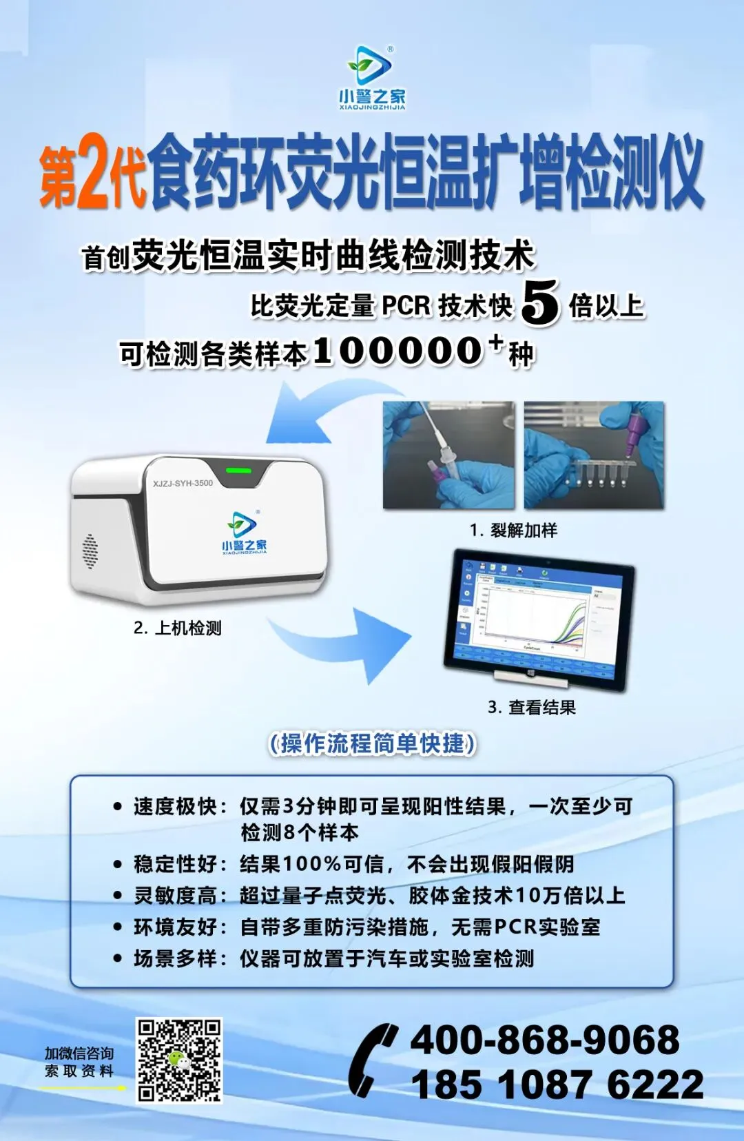 当快检设备不再需要专业门槛,当精准检测不再依赖固定场景,当权威结果不再需要漫长等待,食药环安全治理便迈入了“即时响应、精准打击”的新阶段。小警之家第二代食药环恒温荧光扩增仪以技术极简主义破解行业痛点,用创新设计适配实战需求,不仅重新定义了快检设备的性能标杆,更推动食药环监管模式从“事后查处”向“事前预防、事中控制”的深度转型——这正是科技守护民生的核心意义:让专业的技术,以最便捷的方式,守护每一个人的安全底线。