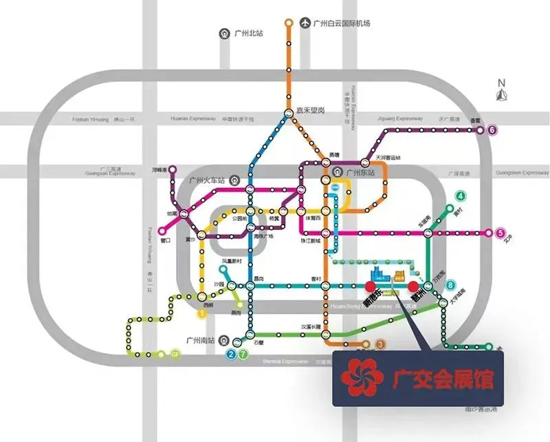 3号线(北延长线)机场北站(2号航站楼)/机场南站(1号航站楼)-体育西路站(转乘3号线)-客村站(转乘8号线)-新港东站(广交会展馆A区)/琶洲站(广交会展馆B区和C区)