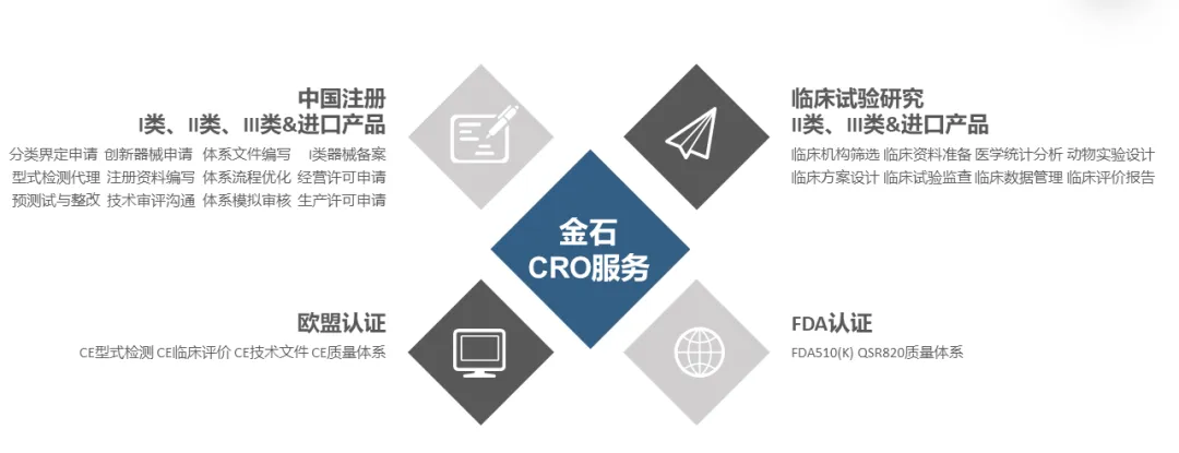 金石团队的项目经验涵盖了肿瘤、心血管、医美类、骨科、神经、眼科、口腔、外科、补片类、皮肤科、有源类多个领域,与主流研究中心及研究者长期保持着密切的合作关系,多年来在国产和进口器械注册工作中,凭借专业的技术和密切的沟通,与NMPA、CMDE等药监部门保持着良好的联系。