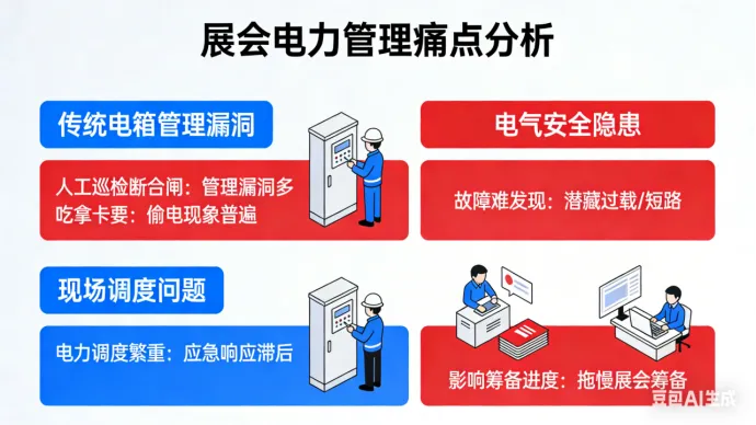 在会展行业数字化转型的浪潮中,“智慧办展、高效运营”已成为展馆、主场搭建企业的核心竞争力。而电力管理作为展会筹备、运营的基础环节,传统电箱的诸多痛点,正成为制约行业数智化升级的“绊脚石”——人工抄表效率低下,动辄耗费大量人力成本;用电异常难以及时发现,潜藏过载、短路等安全隐患;能耗数据无精准统计,无效损耗难以管控;搭建现场电力调度混乱,应急响应滞后,影响展会筹备进度。