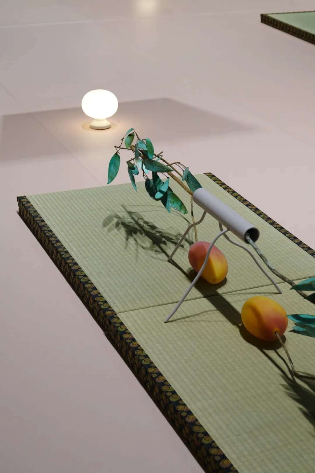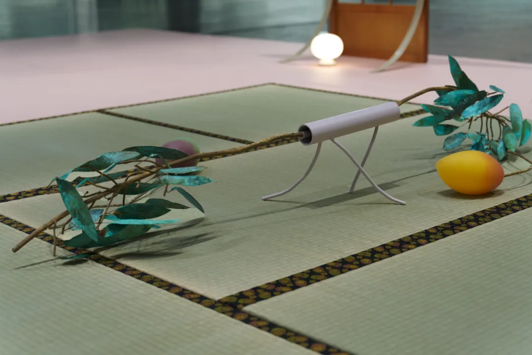 作品并非怀旧式的再现,而是批判性地探讨文化形式如何被移植、调适与重组。为了跨越这些异质元素间的落差,弥合现实与记忆幻象之间的缝隙,艺术家加入了金属杆与悬挂其上轻盈而脆弱的玻璃泡泡。半透明的球体反射并扭曲周遭景象,成为呼吸与记忆的载体,自由游移于障子划定的建筑与文化界限,及地面材料形成的张力之间。最终,整件装置交织了有形与无形:连结混凝土与木材的硬朗边界与芒果植栽柔软而有机的形态。它们以异样而迷人的美感,邀请观者在这个混融空间中穿行——不将其视为冲突之地,而是持续涌现、持续生成的创造场域:见证一种能从历史碎片中建构“家”的、持久而具适应力的精神。