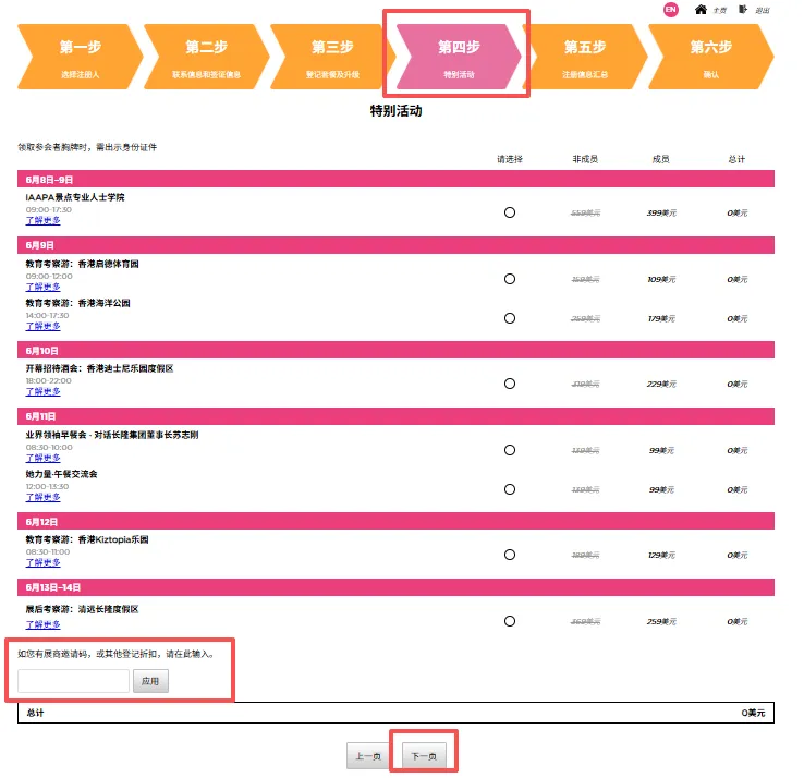 请在登记过程中的“第四步”,勾选您需要参加的活动购买门票。