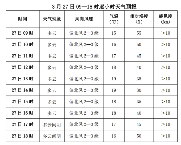 2026年3月26日17时发布,预计 28 日白天有小雨,上午以零星小雨为主,主要降雨时段在中午到傍晚。今天夜间多云间晴,偏北风 2-3 级,最低气温 11℃;27 日多云转阴,偏北风 2—3 级,气温 19~9℃;28 日阴有小雨转晴,偏南风 3—4 级,气温 18~7℃。29 日晴转多云,偏北风 3—4 级,气温 23~11℃。
