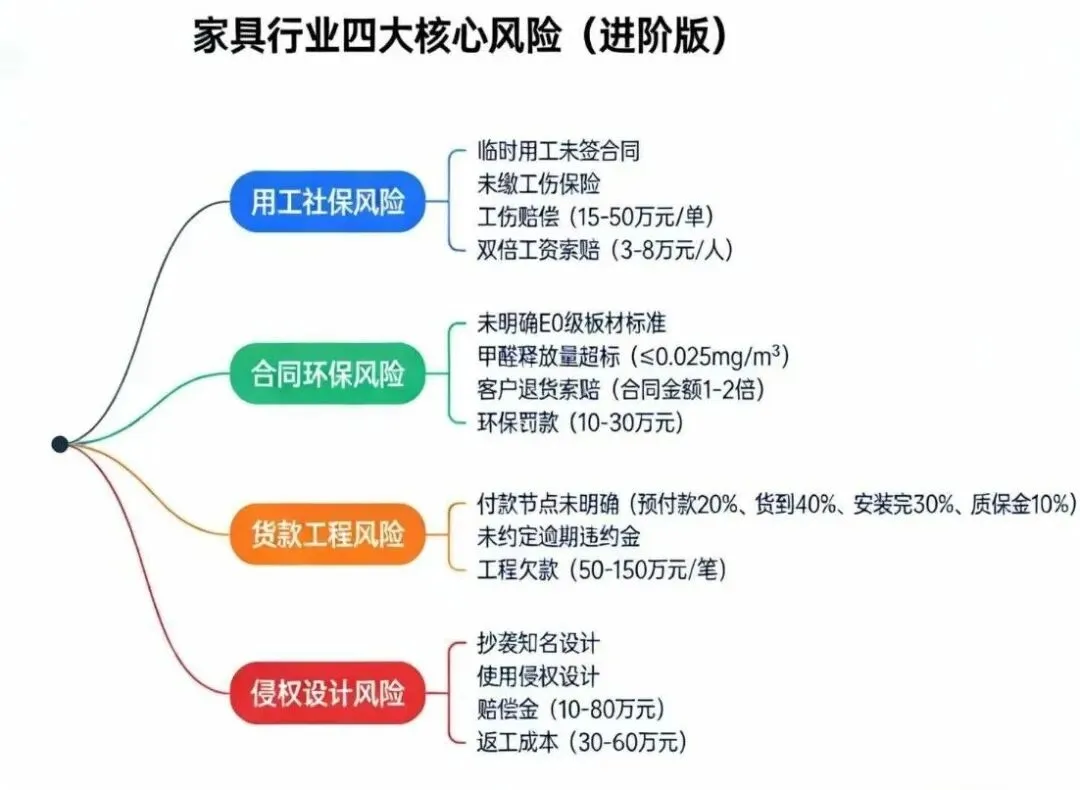 家具行业工程订单金额大(单批50-300万元)、周期长(3-8个月),100-200人规模的中小企业多承接酒店、公寓、房地产精装修家具订单,工程货款占营收比例达40%-60%。这类企业经营中,用工社保(安装工流动性大、社保难覆盖)、环保合规(板材甲醛超标易遭处罚)、工程欠款(房地产商资金紧张)、设计侵权(酒店家具设计抄袭)四大风险如 “现金流吸血鬼”,未聘法律顾问的企业,一次大额工程欠款就可能拖垮现金流——如同车主未加油,车辆随时可能半路熄火。
