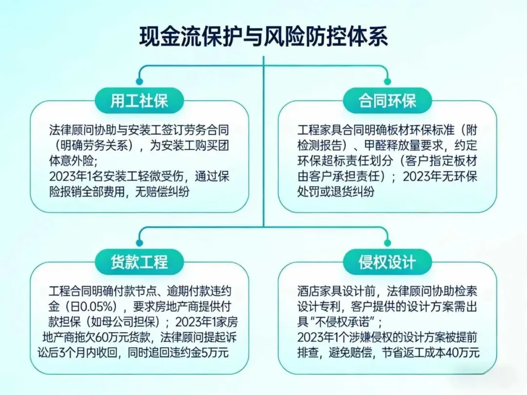 反观同区域200人规模家具厂,年营收约4500万元,每年投入5万元聘请法律顾问,搭建现金流保护与风险防控体系: