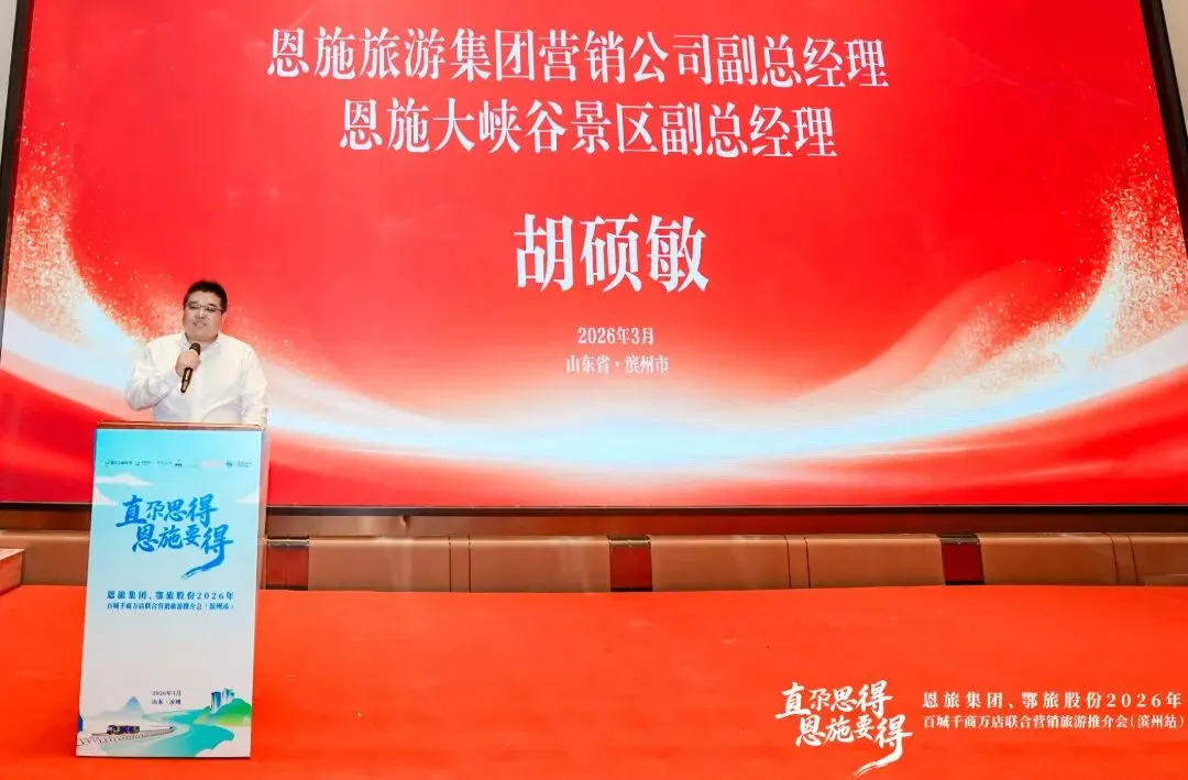 3月25日,恩旅集团山东滨州联合营销推介会成功举办。恩旅集团营销公司副总经理、恩施大峡谷景区副总经理胡硕敏出席活动并致辞,滨州市文旅业界代表、重点旅行商参会。