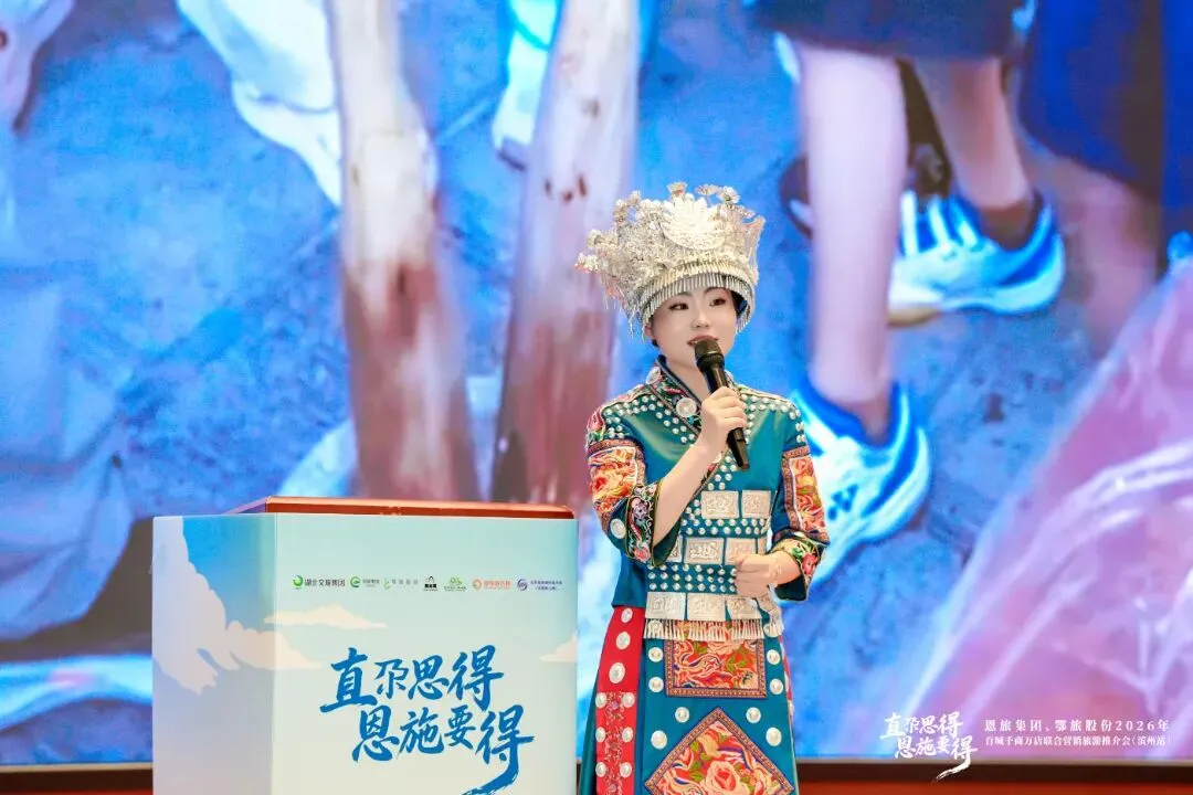 恩旅集团营销公司副总经理、恩施大峡谷景区副总经理胡硕敏在致辞中表示,滨州是黄河文化与齐鲁文化交织的魅力之城,既有渤海湾的壮阔胸襟,又有孙子故里的文脉底蕴,历史厚重、风光秀美,是山东乃至全国极具特色的旅游目的地。恩施地处神秘的北纬30度,坐落于鄂西武陵山脉腹地,是湖北省唯一的少数民族自治州,拥有世界级的山水奇观与独树一帜的土苗风情。两地虽相隔千里,却因同样坚守文旅初心、同样坐拥得天独厚的文旅资源,结下了跨越南北的深厚缘分。此次推介会,正是两地文旅交流、资源互补、客源互送、合作共赢的美好开端。