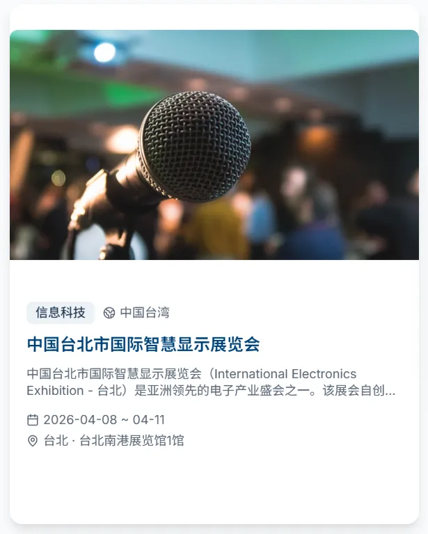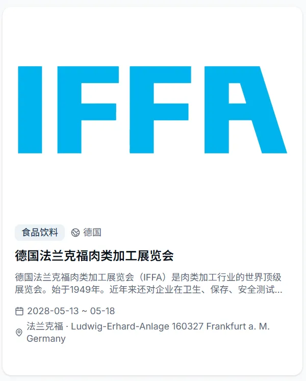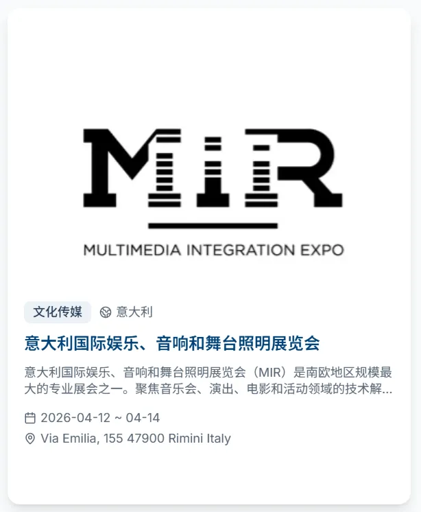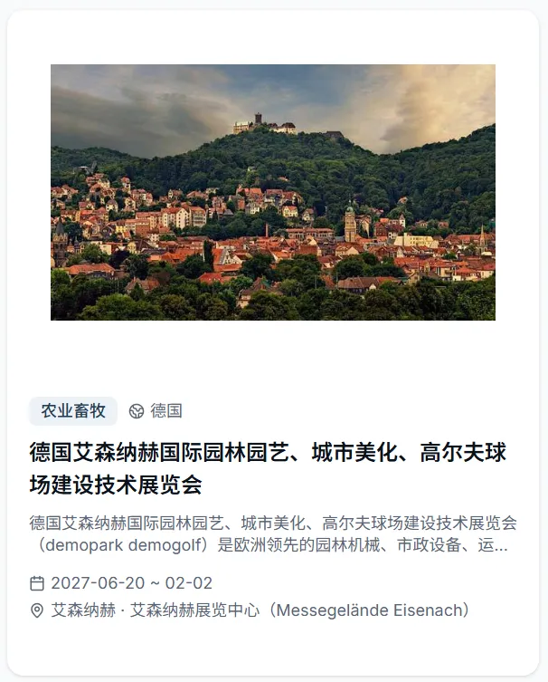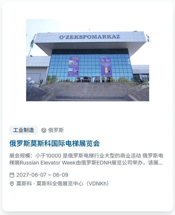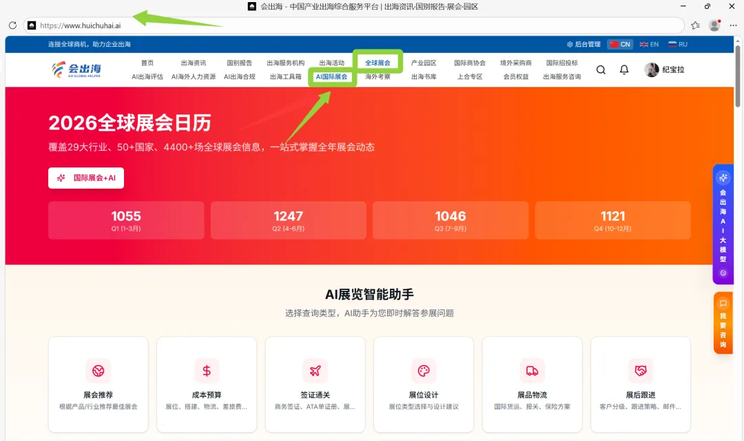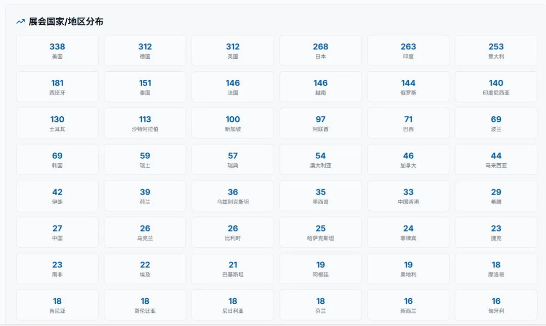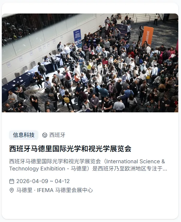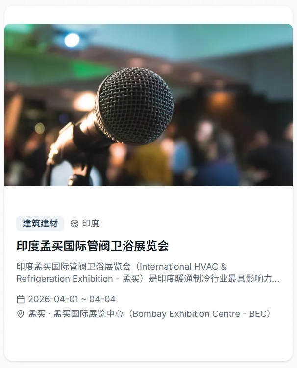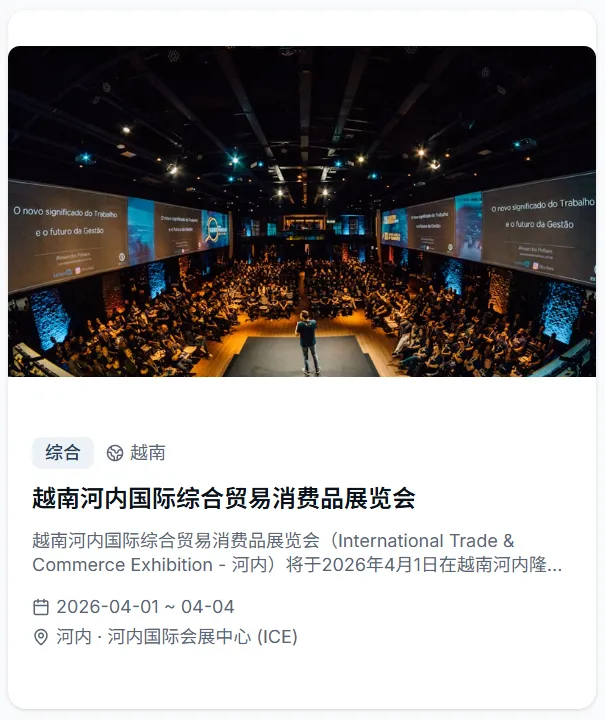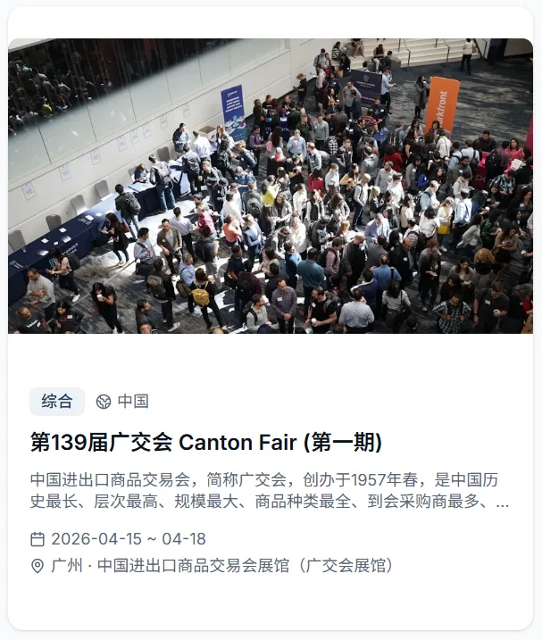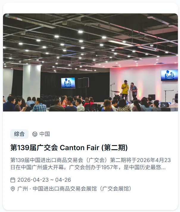 会出海重磅推出全球展会专属功能,依托专业展会资源整合能力,为出海企业打造从信息查询到参展规划的全维度服务平台,让企业出海找展、参展更高效、更精准!平台收录2026年全球4500+展会,覆盖50+国家、30+行业大类,时间跨度涵盖2026至2027年。每个展会均配有详细的展品范围、展馆信息、主办方联系方式和往届数据,并支持按国家、行业、日期进行多维度智能筛选。直观的活动和展会日历视图,一目了然地掌握全年全球展会的时间分布,提前规划参展行程,快速定位符合企业赛道的优质展会!