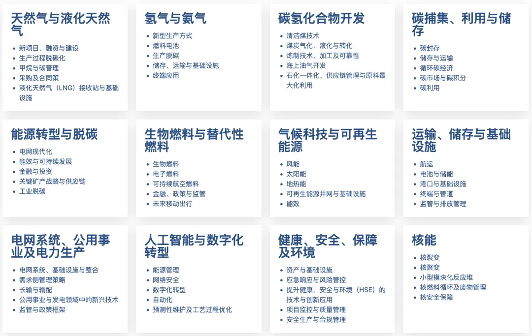 十二大征文主题立足能源转型大背景,紧扣行业发展核心脉络,全面覆盖能源全价值链——从传统油气到新兴氢能,从碳捕集、利用与封存到人工智能赋能,从可再生能源技术突破到电网系统革新,每一个主题均聚焦行业关切的议题与方向,承载着能源转型的现实需求与未来期待。国际能源大会(北京)暨展览会摘要征集现已启动,诚邀您投稿参与!十二大征文主题及子主题