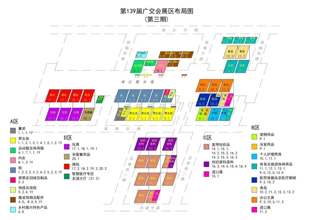 ![]() 第一期:4月15-19日 家用电器、电子消费品及信息产品、电子电气产品、照明产品、新能源、新材料及化工产品、五金、工具、加工机械设备、动力、电力设备、通用机械及机械基础件、工业自动化及智能制造、工程机械(室内/室外)、农业机械(室内/室外)、新能源汽车及智慧出行、摩托车、自行车、汽车配件、车辆 ![]() 第二期:4月23-27日 建筑及装饰材料、卫浴设备、家具、餐厨用具、日用陶瓷、家居用品、钟表眼镜、礼品及赠品、节日用品、家居装饰品、工艺陶瓷、玻璃工艺品、园林用品、编织及藤铁工艺品、铁石装饰品及户外水疗设施 ![]() 第三期:5月1-5日 玩具,孕婴童用品,童装,男女装,内衣,运动服及休闲服,裘革皮羽绒及制品,服装饰物及配件,纺织原料面料,鞋,箱包,家用纺织品,地毯及挂毯,办公文具,医药保健品及医疗器械,食品,体育及旅游休闲用品,个人护理用具,浴室用品,宠物用品,乡村振兴特色产品 |
