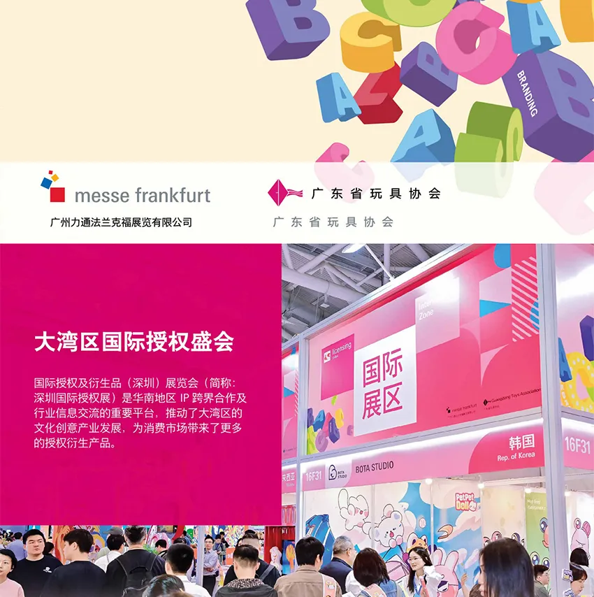 国际授权及衍生品(深圳)展览会由广州玩具展的动漫IP授权展区演变而来,该展始办于1989年,是国内历史最悠久的玩具展会,规模逐年扩大,2010年,主办方开始同期举办广州童车展,近年来,品牌展商参展数量逐年增加。三个展会自2020年起将正式移师深圳举办并分别改名为国际玩具及潮玩(深圳)展览会、国际童车及母婴童用品(深圳)展览会及国际授权及衍生品(深圳)展览会(简称:深圳玩具展、深圳童车展及深圳国际授权展),涵盖各类授权IP,全品类玩具及婴童用品。