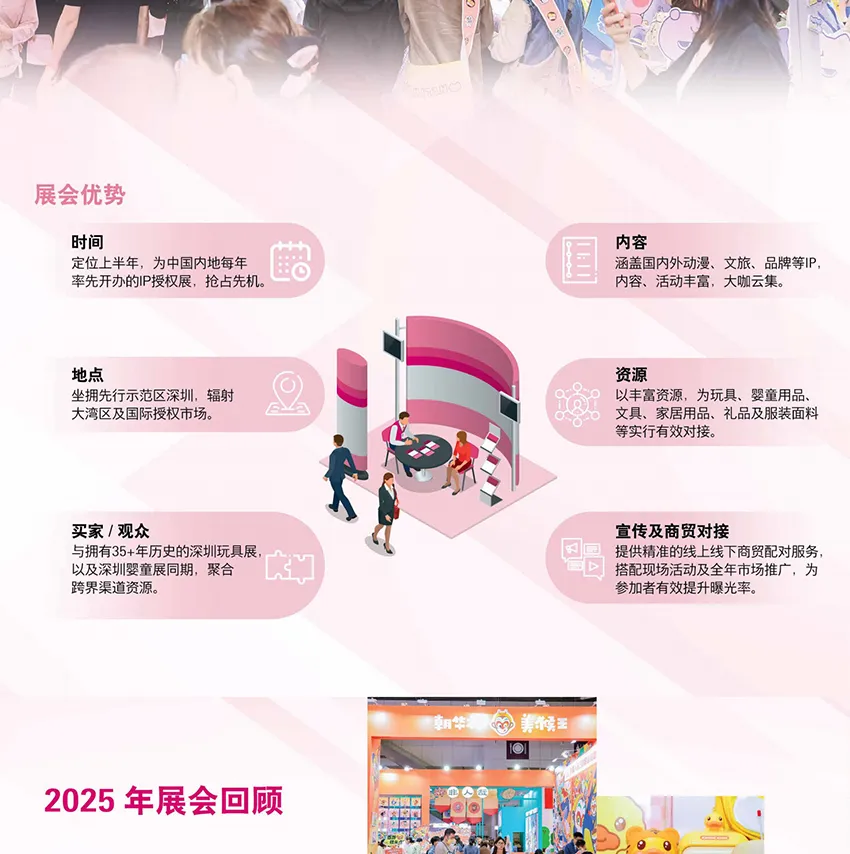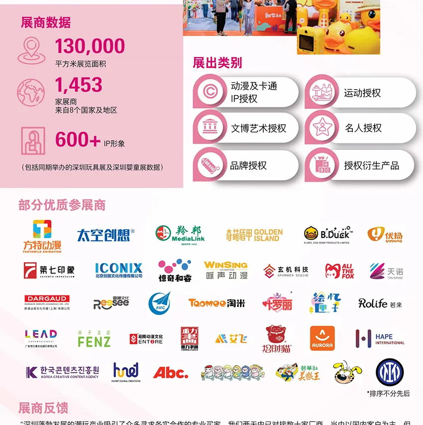 连同同期展览深圳玩具展和深圳婴童展,第7届深圳国际授权展将于2026年4月9至11日在深圳国际会展中心强势回归,展现IP形象,寻找授权机遇,与其它行业进行跨界合作,交流行业资讯的平台,并进一步推动中国授权市场的发展。