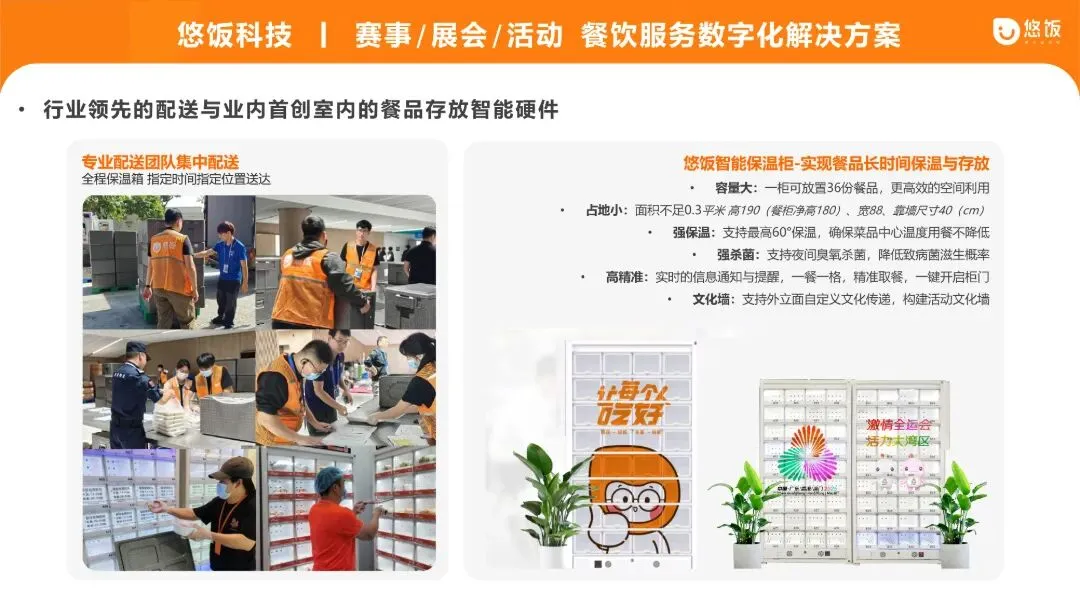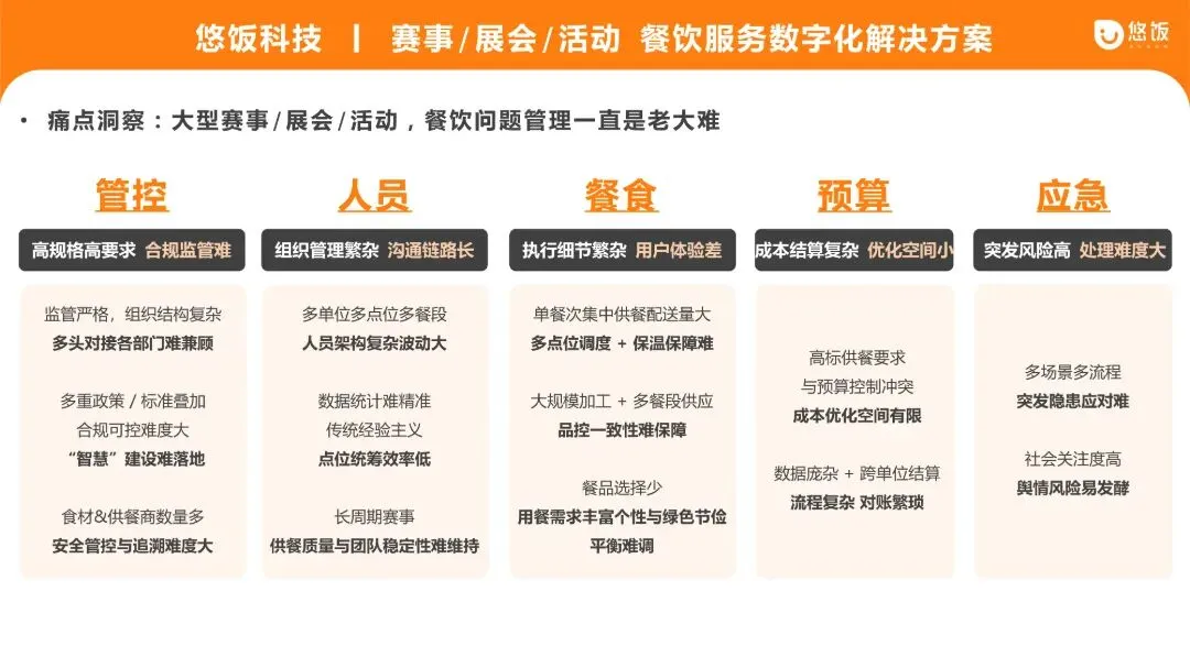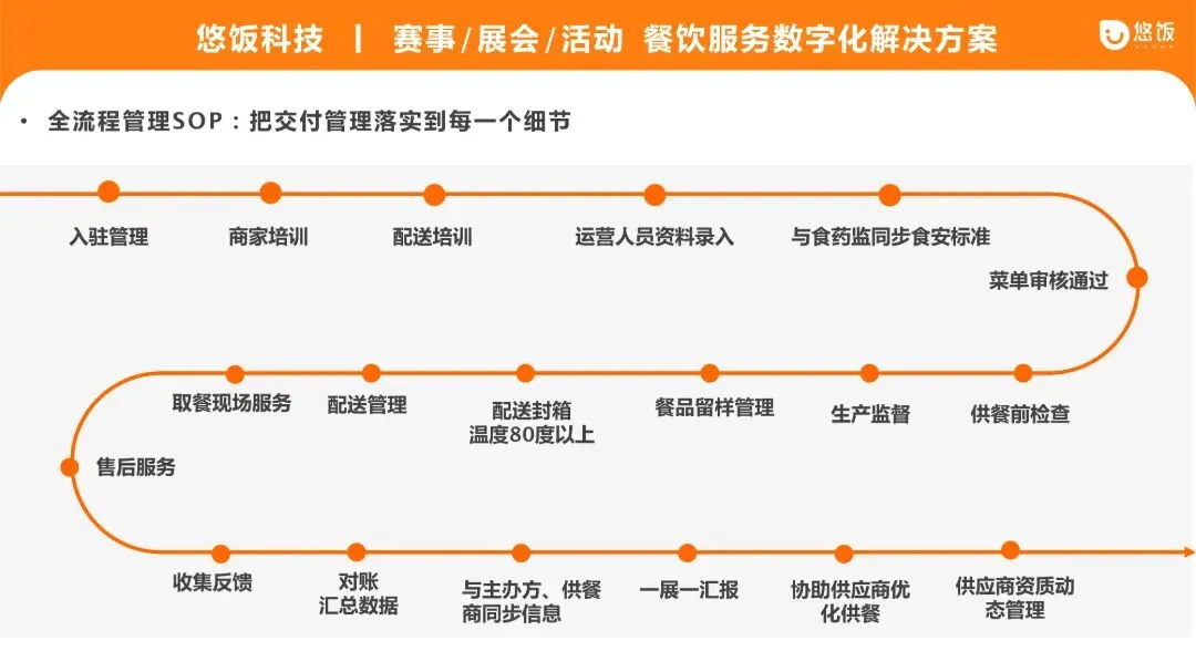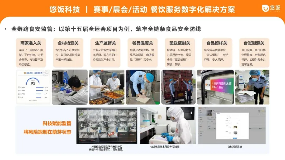 针对大型赛事、展会、活动,多点位供应商+大规模加工 + 多餐段供应,食安和品控的高要求,悠饭科技建立严格的供应商“严准入、强监管、动态淘汰”机制,并运用科技赋能传统监管。