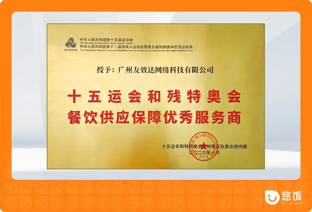 在去年底的国家级最高规格赛事第十五届全国运动会,悠饭作为广州赛区全场馆工作人员餐饮服务唯一中标平台,通过行业十年深耕,沉淀的数字化团餐服务能力,不仅高规格高标准地实现了高效运营交付,获颁「餐饮供应保障优秀服务商」,更“以战代练”,将复杂的保障经验,沉淀为一套可复制的数字化立体解决方案。