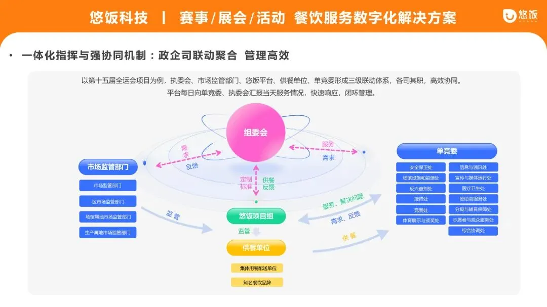 以「十五运会」为例,悠饭项目组在项目启动后,迅速搭建“主办方-平台-供餐单位”三级联动体系,通过明确的权责界面与每日闭环汇报机制,确保监管指令高效传达、执行情况实时反馈,将多头对接转化为聚合管理,让高标准合规要求真正落地。