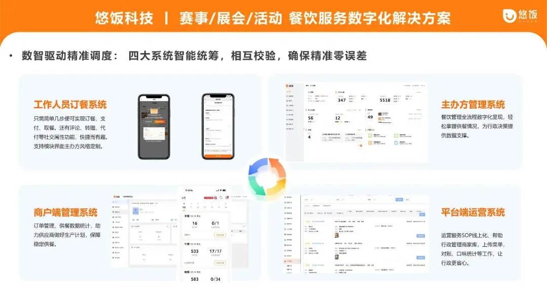 悠饭科技基于自主研发的数字化订餐系统底座,支持为项目开发专属数字化订餐及管理系统,不仅破解传统经验主义统计低效困局,更通过数智能力,为主办方成功搭建起“仪表盘”与“导航仪”:实现过程可视化、决策科学化、管理精准化。