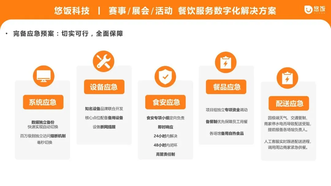 针对大型赛事、展会、活动,多场景多流程,社会关注度高,突发隐患应对难,舆情风险易发酵的挑战,悠饭科技围绕系统、食安、配送、舆情等多方面,制定全方位应急预案,并配备7x24小时专项服务团队,确保任何突发状况均在15分钟内响应,48小时内闭环处理。