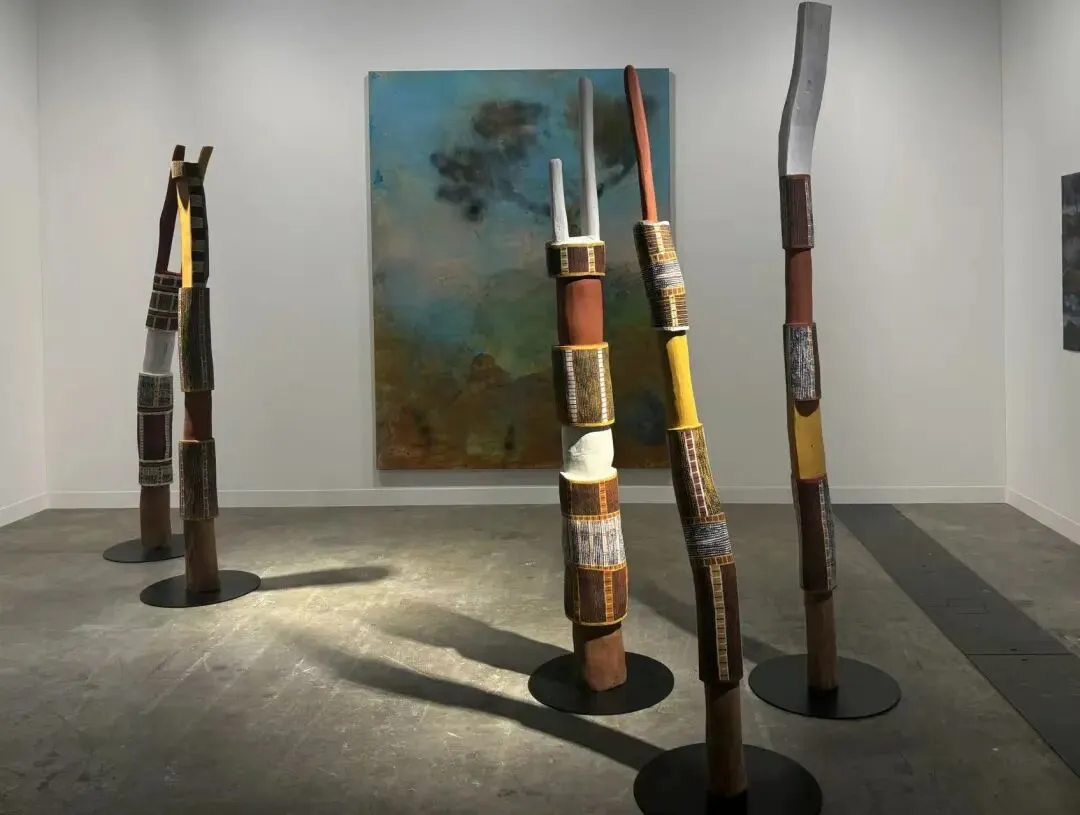 2026年巴塞尔艺术展香港展会“艺路回声”现场,图片由巴塞尔艺术展提供今年巴塞尔艺术展香港展会的全新展区“艺路回声”(Echoes),旨在梳理当代艺术实践中的共鸣,通过并置近五年内最多三位艺术家的作品,促成其间的对话。其中,“艺路回声”一词所蕴含的“挥之不去的痕迹或遗迹”之意,与部分首秀作品的主题不谋而合,艺术家们来自澳大利亚、津巴布韦、越南及哥伦比亚等地,其创作深入挖掘被掩埋的历史,揭示了殖民主义遗留的印记。在Station艺廊展位呈献的“Between Worlds, Within Lines”中,三位杰出的澳大利亚艺术家深入探讨了传承、景观与文化记忆的主题。Pedro Wonaeamirri的Tutini柱是一件树状雕塑,饰以木梳绘制的精细点状图案。该作品呼应了传统葬礼仪式中的身体彩绘和血木桩设计,直接继承自其长辈,并延伸了这位来自梅尔维尔岛的提维艺术家兼文化领袖所秉承的原住民习俗。2026年巴塞尔艺术展香港展会Pedro Wonaeamirri的作品现场,由Station画廊呈献,图片由巴塞尔艺术展提供