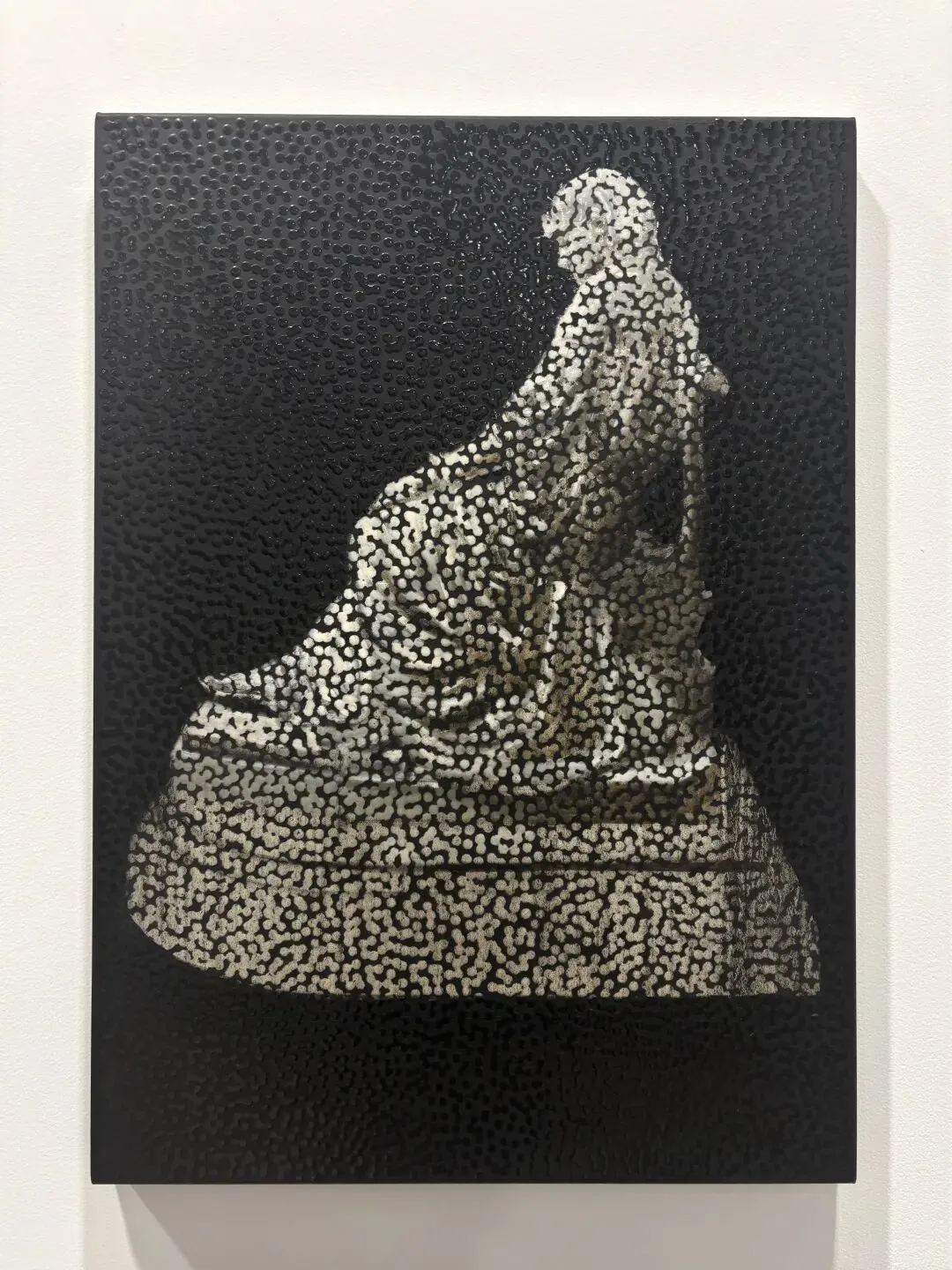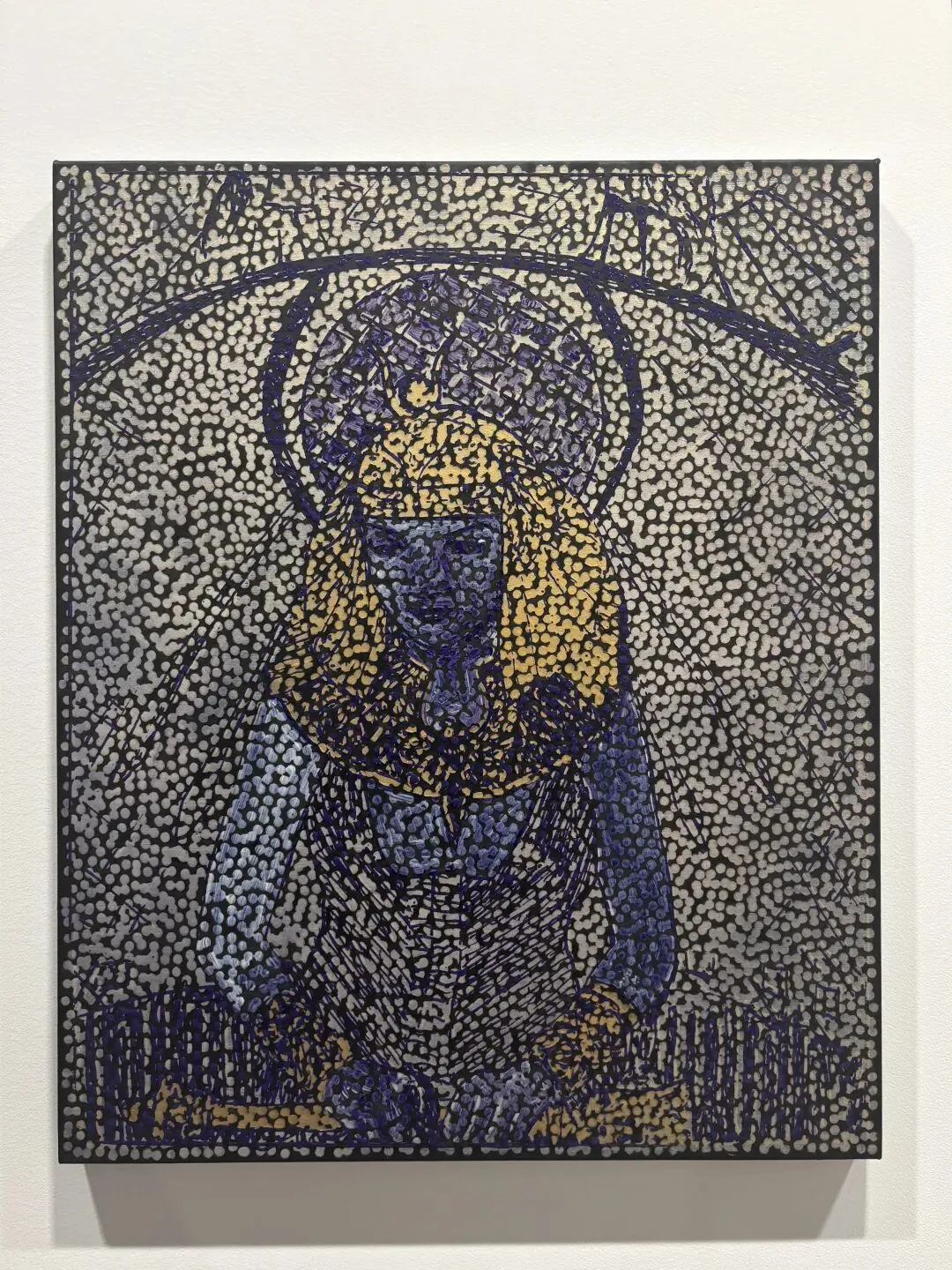 丹尼尔·博伊德(Daniel Boyd)在他的点画作品中也运用了类似的精妙叠加技法。他将古董画、偶然发现的原住民肖像照以及艺术家祖先的关联地点等图像素材进行叠加,并覆盖以胶点。这些点状图案构成了如透镜般的星群,使观者得以一窥图像的真容,而点与点之间的空间则构成了深邃的背景。2026年巴塞尔艺术展香港展会丹尼尔·博伊德的作品现场,由Station画廊呈献,图片由巴塞尔艺术展提供