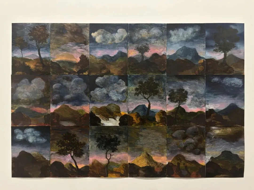 博伊德的作品引导我们审视这些被遮蔽的中间区域以及历史记录中被忽略之处,究竟隐藏着什么。间隙也是Tony Clark的“myrioramas”系列作品的特点,该系列由多个绘画画板组成,灵感来源于19世纪欧洲的一种沙龙游戏,玩家通过重排插图卡片来组合不同的古典风景。与博伊德相似,Clark也拒绝单一、简单的视角,将他描绘的山川树木的浪漫风景分割成网格。2026年巴塞尔艺术展香港展会Tony Clark的作品现场,由Station画廊呈献,图片由巴塞尔艺术展提供