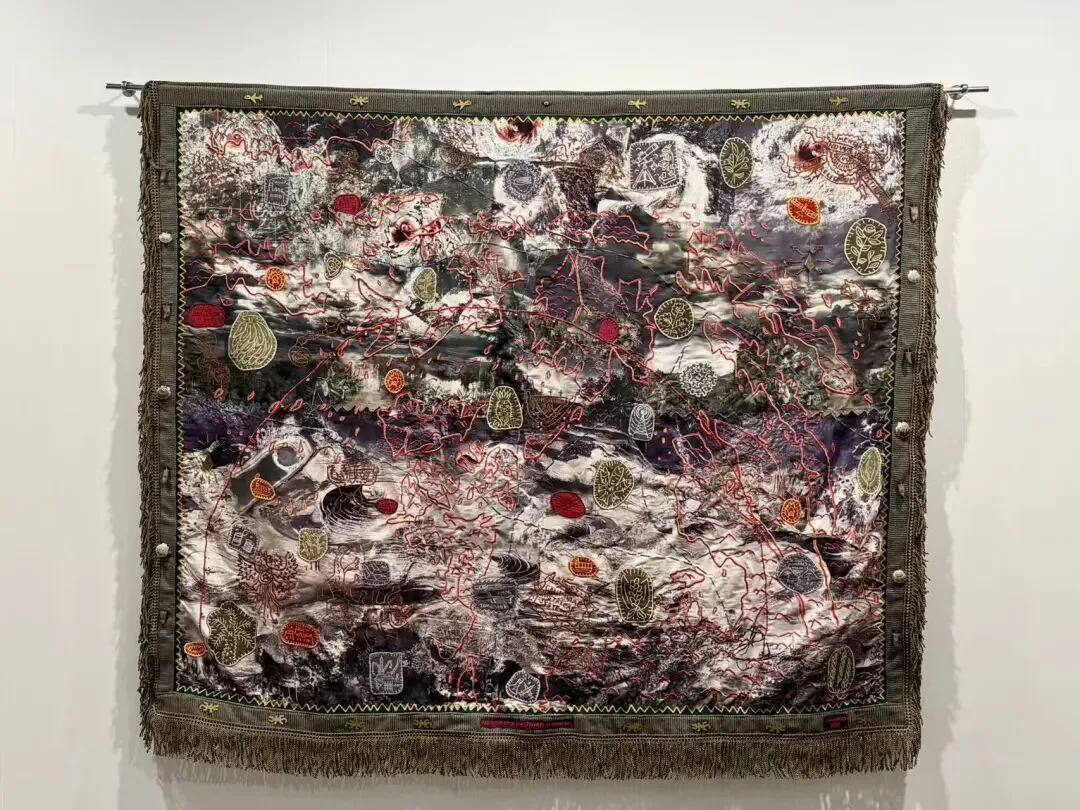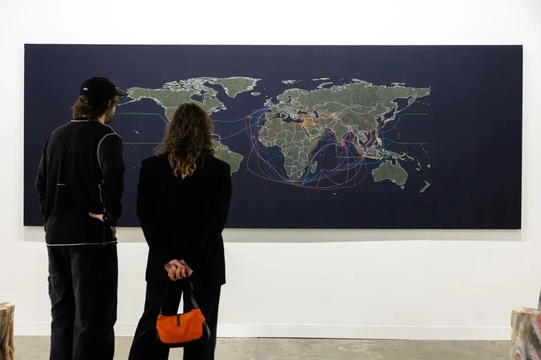 在Max Estrella艺廊的展位上,越南裔艺术家蒂梵妮·钟(Tiffany Chung)与哥伦比亚艺术家Miler Lagos的作品借鉴地图、书籍和植物学研究,具象化了流离失所对社会地理与生态环境的持久性影响。钟创作的巨幅刺绣世界地图,以细致缝制的重叠丝线勾勒出全球香料贸易的历史脉络。该地图辅以详实的数据资料,描绘了香料贸易在不同历史时期对商业、移民和烹饪传统所产生的连锁效应。在其配套的香料刺绣研究中,钟所呈现的精美香料标本,宛如被连根拔起,漂浮于亚麻底布之上。2026年巴塞尔艺术展香港展会蒂梵妮·钟的作品现场,由Max Estrella艺廊呈献,图片由巴塞尔艺术展提供