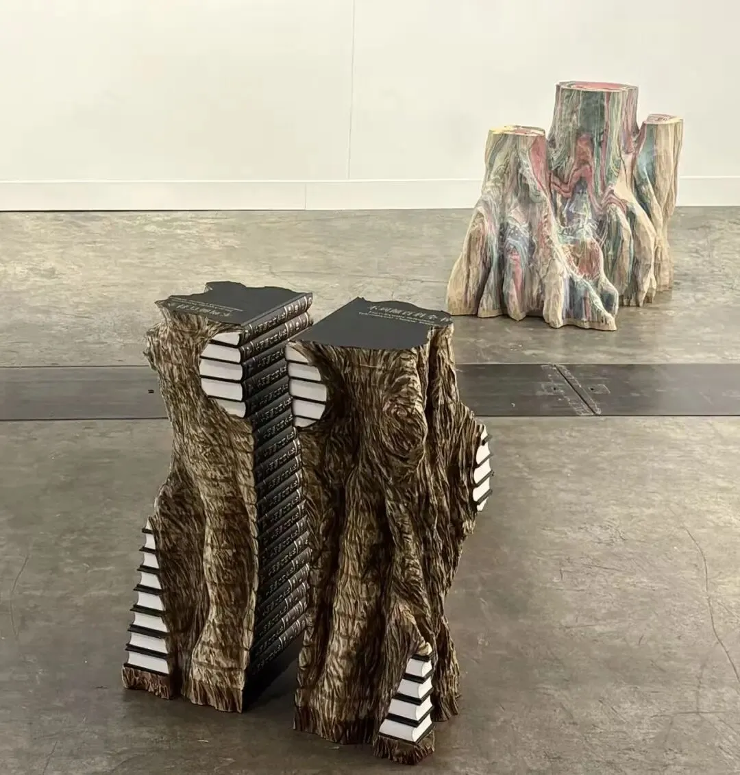 Lagos则将另一种物质文化形式归还其本源,创作了由堆叠的旧书构成的树形雕塑,这些书籍涵盖了植物学、贸易和环境史等领域。其书脊在每件雕塑垂直核心的横截面上清晰可见,仿佛这些复合树干被闪电整齐地从中心劈开。围绕着每棵“树干”,是书籍书口形成的同心圆,象征着与资源开采相关的、人类活动的年轮。2026年巴塞尔艺术展香港展会Miler Lagos的作品现场,由Max Estrella艺廊呈献,图片由巴塞尔艺术展提供