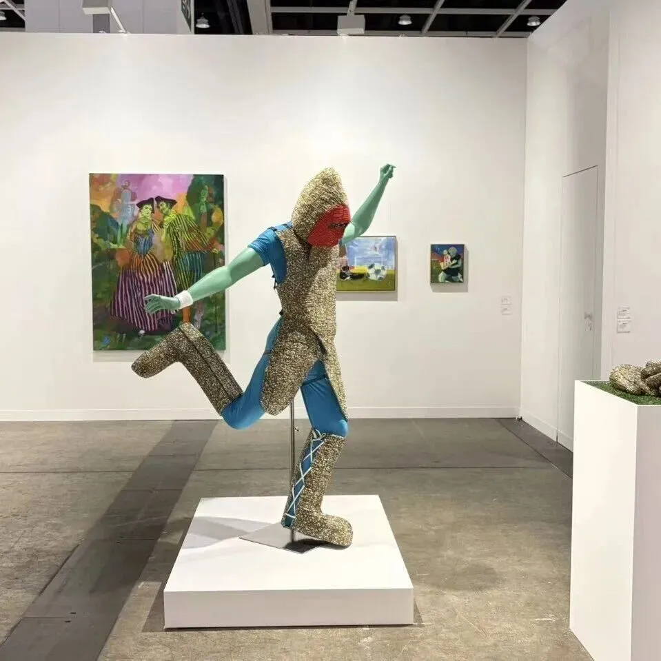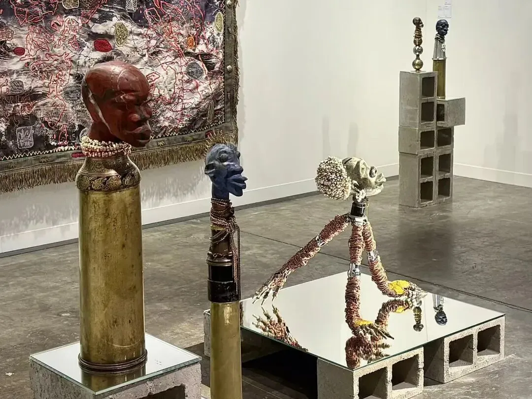 Terrence Musekiwa则在其混合人物雕塑中,将传统的石雕技法与现成品相结合。这些现成品折射出几个世纪以来的习俗,以及更近期的社会背景。Musekiwa使用的石材来自其祖国津巴布韦,他从中汲取了其Chikaranga祖先的文化传承,以及其雕塑家父亲传授的雕刻技艺。Musekiwa的雕刻头像与多种现成品相结合,包括宝螺、工业废料以及20世纪70年代的炮弹。2026年巴塞尔艺术展香港展会Terrence Musekiwa的作品现场,由Nome艺廊和Catinca Tabacaru艺廊呈献,图片由巴塞尔艺术展提供