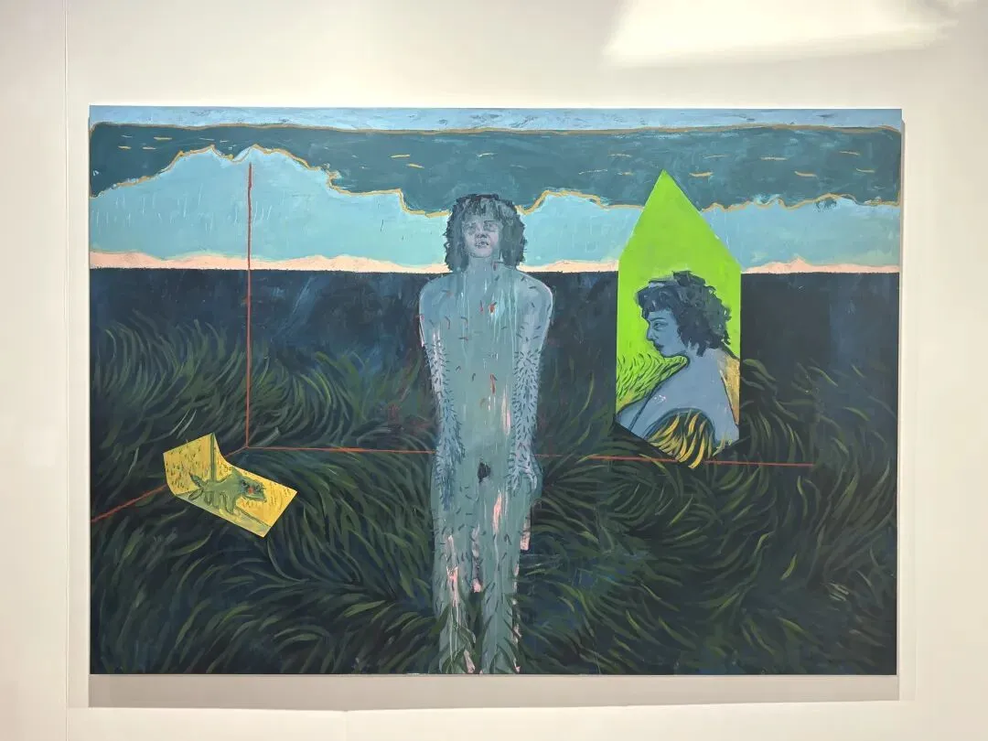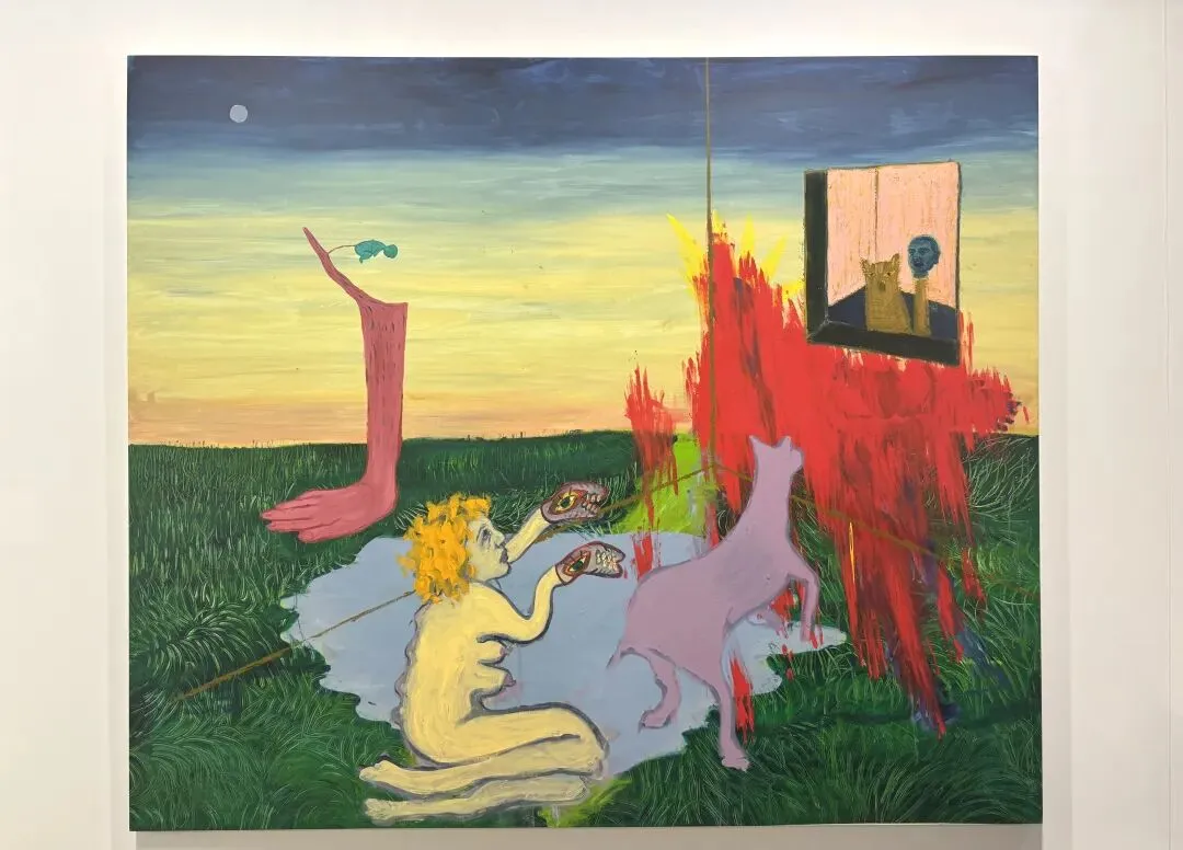 年轻的摩洛哥艺术家Youssra Raouchi的绘画梦境,则呈献了另一种形式的挖掘。这些是自我的考古,充满神话意象,并借鉴了包括北非阿马齐格人(Amazigh)在内的多种文化传统。混合形态——一个身体呈棍状的小丑(抑或是一个顶着小丑脑袋的棍子?);一只手化作嘴巴的女人——似乎与生动描绘的风景融为一体,或从中涌现。在这些因地理与时间而充满殖民主义回响的作品中,Raouchi的画作占据了一个无国界的自主地带,思想和联想在此得以自由驰骋,身份变得流动。与其他作品一样,它们在主流文化叙事的边缘和缝隙中创造了可能性的空间,从而可能生成看待世界的新颖而重要的视角。2026年巴塞尔艺术展香港展会Youssra Raouchi的作品现场,由Nome艺廊和Catinca Tabacaru艺廊呈献,图片由巴塞尔艺术展提供