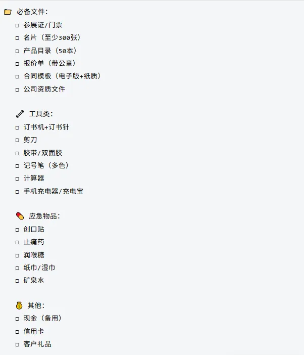 ①参展必带:名片、Catalog、报价单、样品、公司介绍、视频资料、客户记录表。