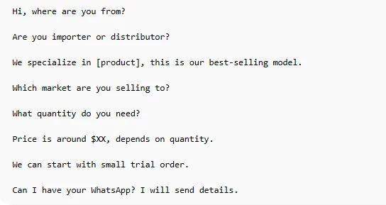 遇到有经验的买家可以直接聊价格,新客户的话可以多跟客户讲解产品,闲逛的客户的话,看客户情况,如果忙的话也可以礼貌快速结束。有需求的客户,一般都会问价格 / MOQ。