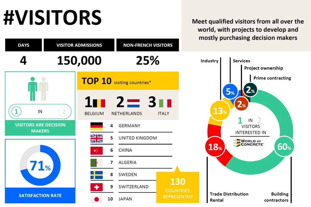 法国巴黎INTERMAT国际工程机械及建筑机械博览会是与德国慕尼黑bauma和美国拉斯维加斯CONEXPO齐名的国际工程机械三大展会之一,该展会创办于1988年,每三年一届,已成功举办十届。作为全球三大展之一法国展INTERMAT,具有极高的知名度和影响力,并以其位于欧洲、中东、非洲区域(EMEA)的地理优势,在立足欧洲的同时,辐射非洲和中东市场。展会主办方深入了解了欧洲、中东和非洲的12个国家(法国、比利时、德国、意大利、荷兰、英国、阿尔及利亚、科特迪瓦、肯尼亚和摩洛哥)的行业市场信息,为展商提供有发展潜力的市场资讯,并积极引导相关国家地区的买家参观展会,取得明显成效。数据显示这些市场在工程机械行业具有巨大的市场和发展空间:各地区的项目投资额,到2030年,欧洲有925亿欧元;到2040年,非洲有3,070亿欧元;到2033年,中东有2390亿欧元。INTERMAT展会除了原有的开发欧洲市场作用外,在开拓非洲、中东欧的市场方面独树一帜,为展商提供了更多的商机。