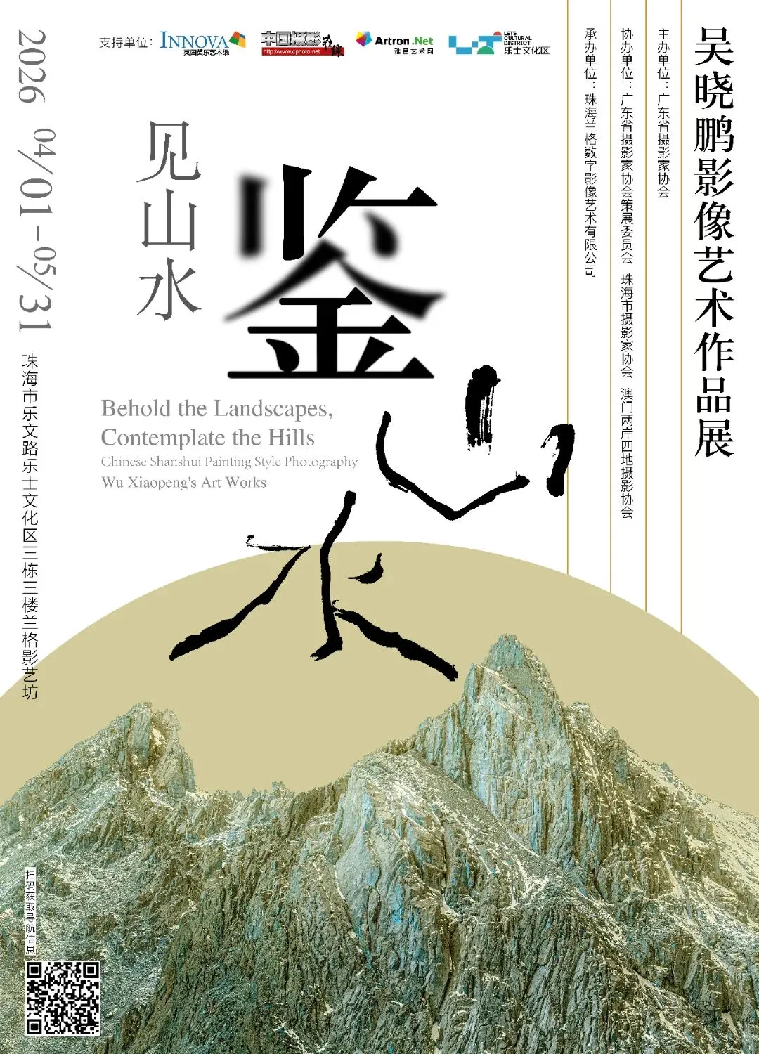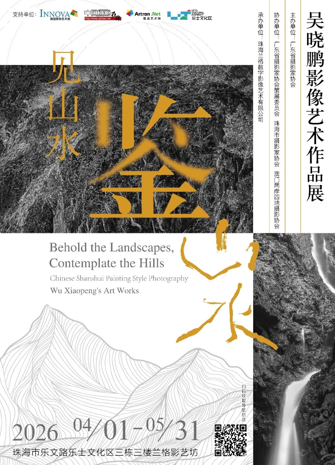 由广东省摄影家协会主办,广东省摄影家协会策展委员会、珠海市摄影家协会、澳门两岸四地摄影协会协办,珠海兰格数字影像艺术有限公司承办的「见山水・鉴山水 —— 吴晓鹏影像艺术作品展」,将于2026年4月1日至5月31日在珠海兰格影艺坊艺术空间展出。