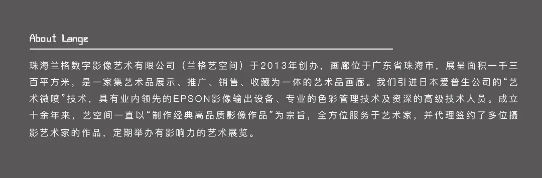 珠海兰格数字影像艺术有限公司(兰格艺空间)于2013年创办,画廊位于广东省珠海市,展呈面积一千三百平方米,是一家集艺术品展示、推广、销售、收藏为一体的艺术品画廊。我们引进日本爱普生公司的"艺术微喷"技术,具有业内领先的EPSON影像输出设备、专业的色彩管理技术及资深的高级技术人员。成立十余年来,兰格一直以"制作经典高品质影像作品"为宗旨,全方位服务于艺术家,并代理签约了多位摄影艺术家的作品,定期举办有影响力的艺术展览。