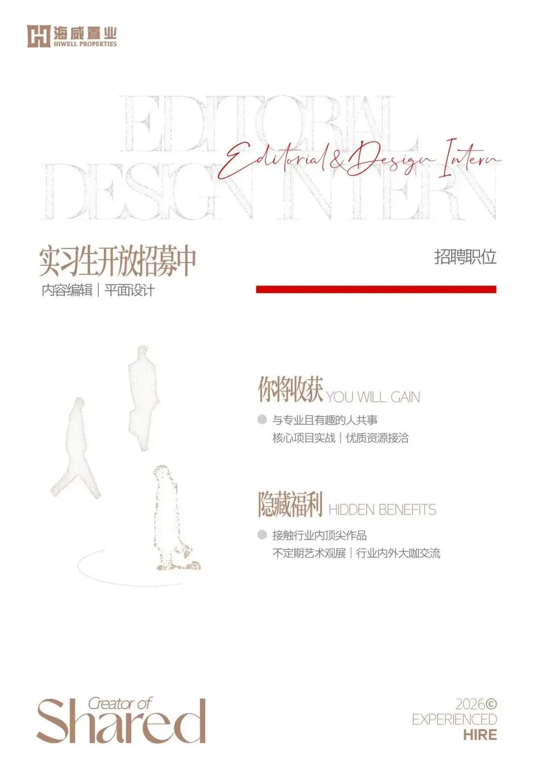 我们是一家有7年品牌历史的大漆原创设计师轻奢饰品品牌。我们有使命感,希望一直引领大漆饰品原创设计、打造一个具有时代性的本土设计师品牌,希望可以成就自己成为一家本土轻奢饰品品牌; 我们很松弛,工作室张弛有度(压力大也没有用),偶尔(经常)手忙脚乱,我们还有很多(真的是)需要完善、提升、改进的空间,我们每个人都是一个强大的战士,但是是一群人在战斗。我们很简单,我们彼此真诚相待,我们一切以做事为导向,喜欢实力派和不断自我精进的队友。 前期围绕小红书做深度运营,包括但不限于笔记策划、拍摄搜集内容素材、发布、数据维护分析、社群运营、投流策划、直播优化、转化执行等; 职场经验1-3年,完全没有经验亮出你的才华和优势也可以聊喜欢真诚、松弛、有弹性、自由平等、有创造力的小工作室,工作环境 喜欢美,有自己的穿搭主张,喜欢东方美学,坚定的支持原创 喜欢表达、热爱分享、享受与人交流、擅长与线上陌生人交互 有传统市场营销背景、懂新媒体基本逻辑、懂经营品牌和卖货的区别、懂品牌运营底层逻辑 小红书重度用户,涉猎视频号、抖音、INS,有小红书运营经验优先 上海,徐汇区余庆路(梧桐区) 坐班➕弹性工作制,不接受完全线上远程配合品牌部做平面输出,包括不限于结合地产项目的海报、线上账号排版,及其他类型视觉表达的共创。专业使用平面设计相关软件、ai软件、与简单视频剪辑类软件使用。简历发送至:蒋女士 13325711682(vx同号)*以上招聘信息由招聘方委托艺more发布
