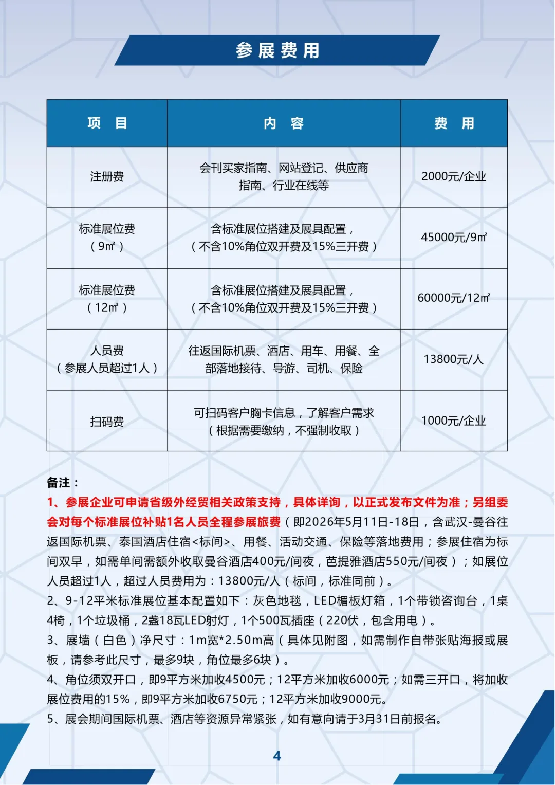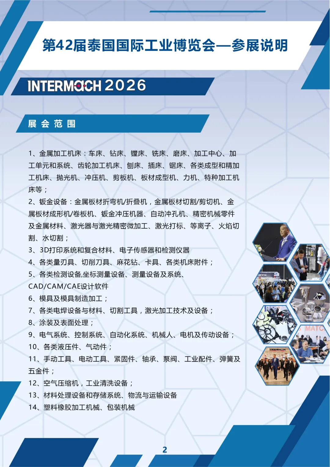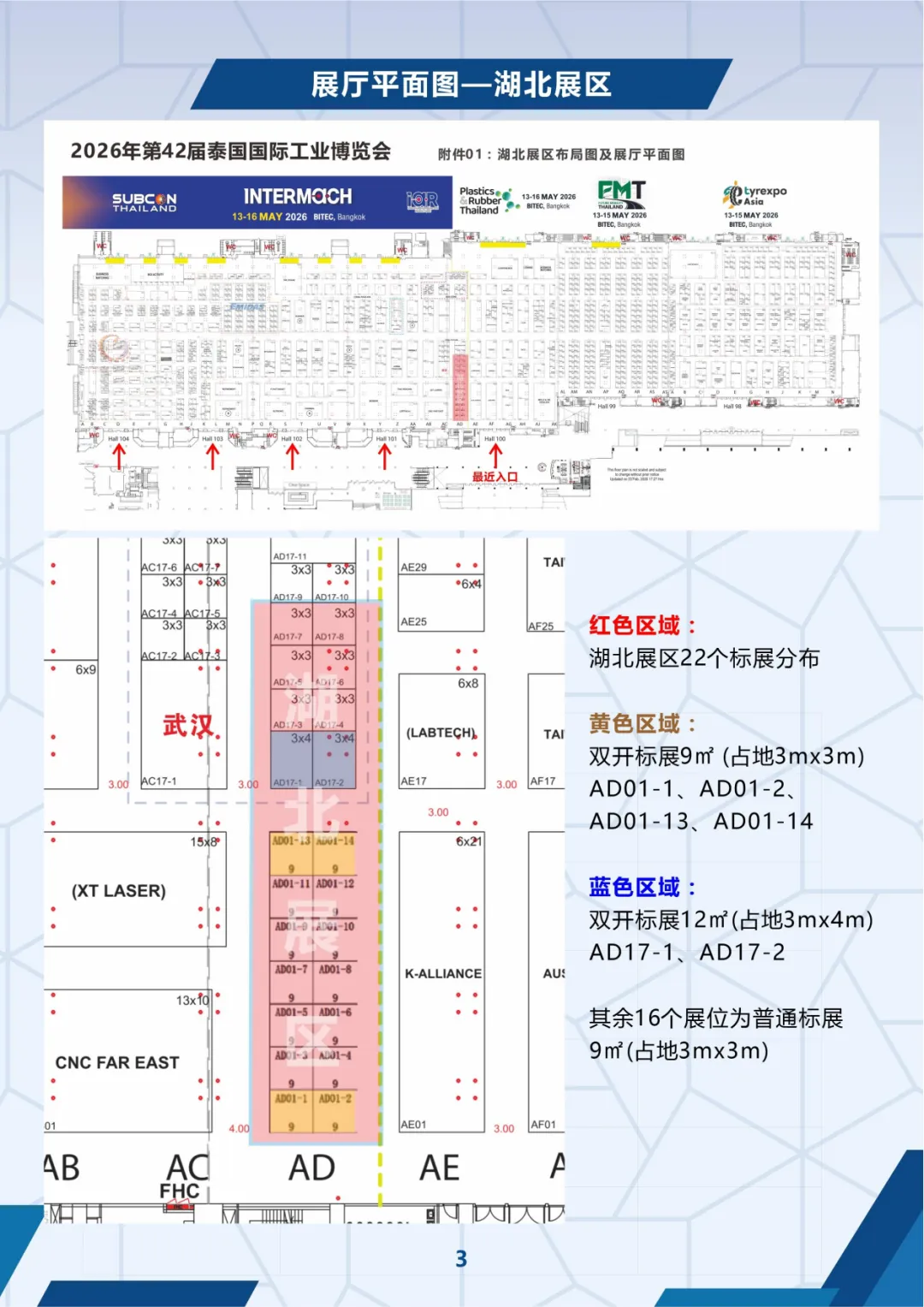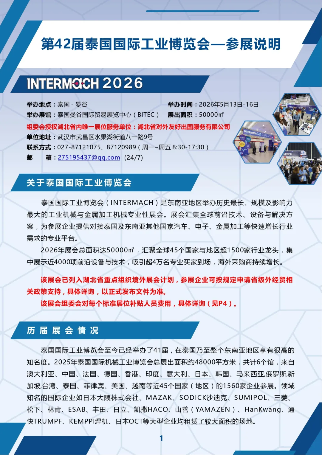 第42届泰国国际工业博览会将于5月13日-16日在泰国曼谷国际贸易展览中心(BITEC)举办。该展会是落实省委、省政府部署要求,支持鼓励湖北企业积极开拓国际市场、抢抓订单,提高国际竞争力的重点境外展会,已列入湖北省《2026年“千企百展出海拓市场”行动第二批展会名录》计划。参展企业可按规定申请省级外经贸补贴政策支持,并享受组委会对每个展位1位人员全程差旅费用补贴。