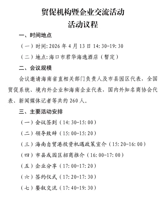 海南贸促会将于4月13日主办贸促机构暨企业交流活动,活动将邀请海南省相关厅局介绍自贸港封关后相关政策,邀请相关市县、园区进行招商推介,活动议程(拟定)如下: