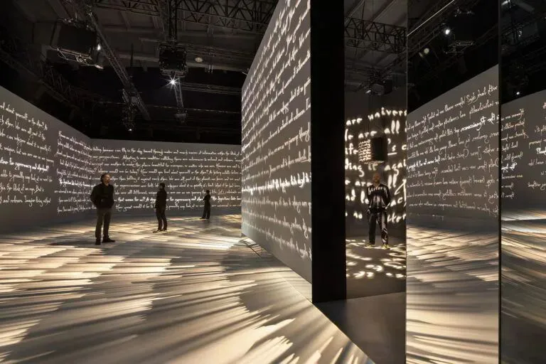 打破物理边界,营造无限感:墙面 / 地面 / 顶面整铺镜面膜,通过反射将空间视觉无限复制,小展厅瞬间变成“流动宇宙”,让观众置身于光影与文字的洪流中。