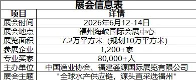 展品范围:各类水产品(冷冻、冰鲜、鲜活、干制)、水产预制菜、精加工水产食品、水产品加工储运设备、智慧渔业(人工智能、信息化建设)、远洋捕捞工具、水产饲料与种苗、鱼药与水质等