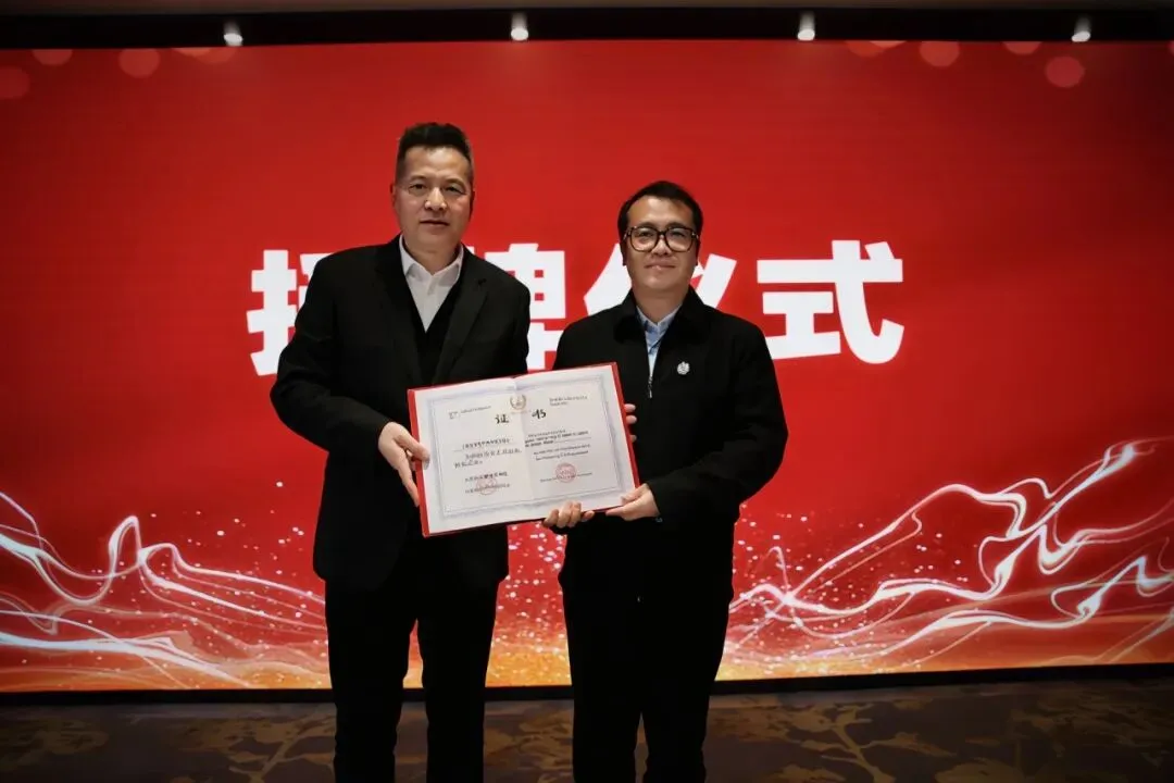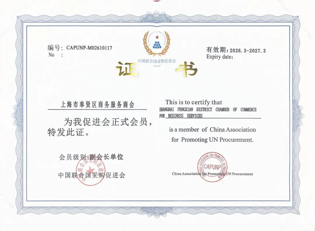 中国联合国采购促进会会长王栩男先生为副会长单位——上海市奉贤区商务服务商会授证书,商务服务商会会长郑元生先生接受。