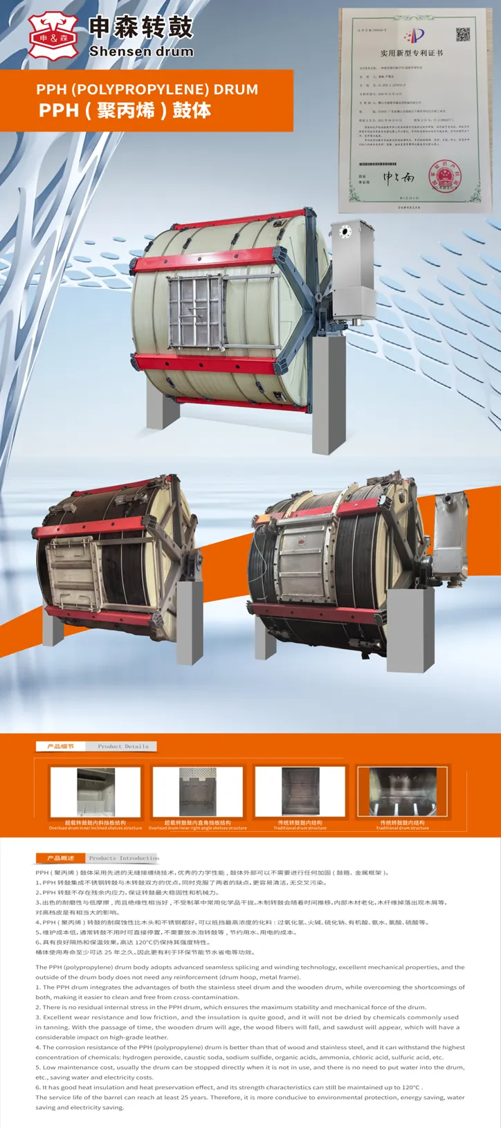 Shensen Machinery Technology (Guangdong) Co., Ltd. is a professional manufacturer of various wooden and polypropylene (PPH) tanning drums and paddles.
