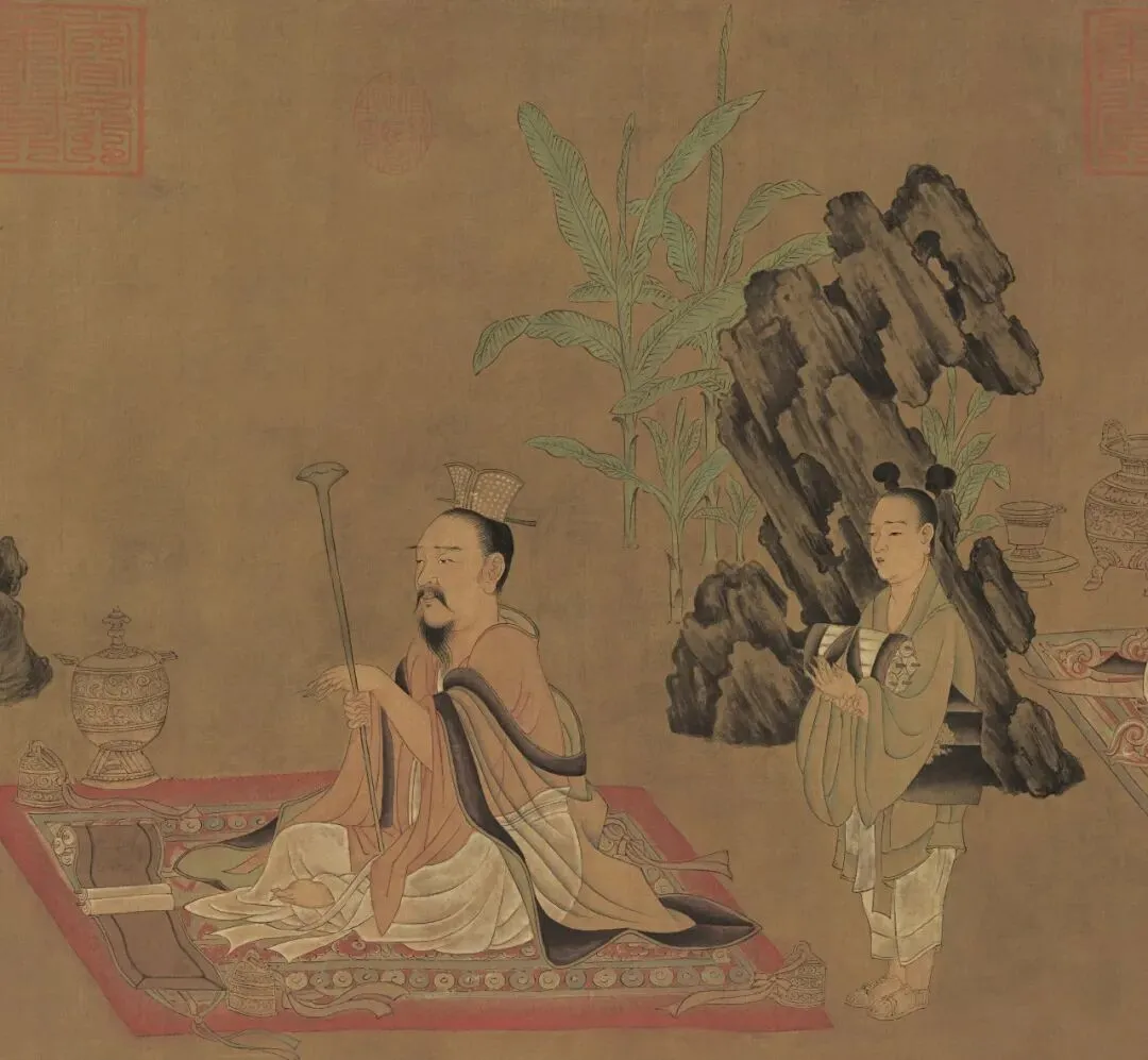 此为目前传世最早绘有独立奇石的画卷之一,描绘竹林七贤“不事王侯”的生活场景。在山涛与王戎的身前右侧,各置有一方奇石,其形态已具备后世赏石的基本特征。画中奇石并非简单点缀,而是作为高士们“闲居理气”的精神凭依,仿佛汉代博山炉所象征的蓬莱仙境。孙位以细笔勾勒石形,水墨晕染体积,开启了后世以石喻仙山、以石寄林泉的审美先河。一方拳石,在此已是方寸之间的昆阆之形。