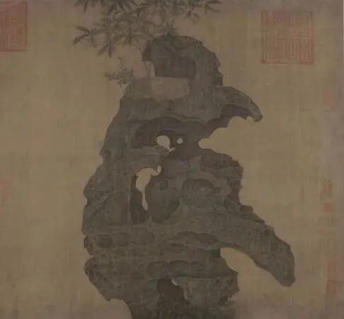宋徽宗以帝王之尊亲绘此石,开启了中国绘画史上以单块奇石为独立创作对象的先河。画中太湖石宛如蛟龙盘旋,顶端生有异草,石上楷书“祥龙”二字。徽宗以墨笔层层渲染出石之坑眼,结构分明,细腻入微,将“瘦、漏、皱、透、丑”的赏石五德尽收笔底。题画诗云“彼美蜿蜒势若龙,挺然为瑞独称雄”,将奇石视为国运祥瑞之兆。此图首次实现了诗、书、画、印的完整统一,构图极简而格调雅致,是院体画精工与文人意趣的完美融合。