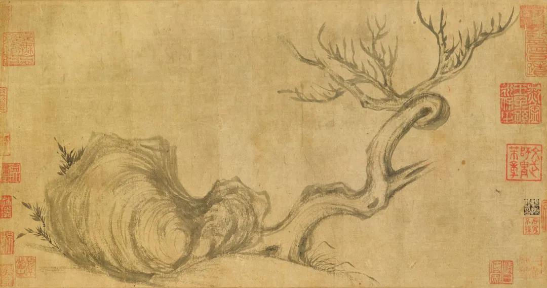 此图传为苏轼所作,是文人墨戏画石的典范。画面左侧以枯笔疾扫出一块奇石,石后数枝野草,右侧一株枯木虬曲盘折。苏轼笔下的石不求形似,全以书法用笔写出——飞白如皴,转折如勒,石的孔窍与纹理皆是笔墨节奏的痕迹。正如米芾所评“子瞻作枯木,枝干虬屈无端,石皴硬亦怪怪奇奇无端,如其胸中盘郁也”。这块“怪怪奇奇”的石头,实则是画家胸中块垒的物化,是文人画“写意”精神的早期实践,开启了后世以石抒怀的先声。
