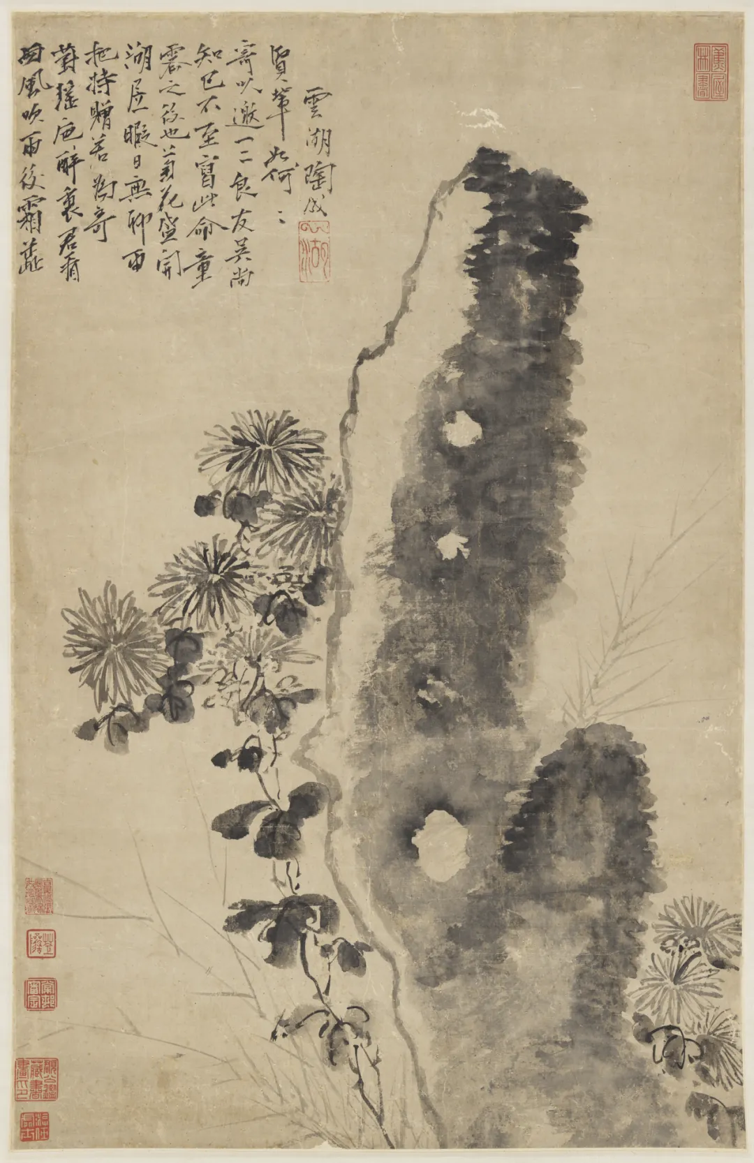 陶成此图,是“孤峰映道”中一份疏狂的自白。画中湖石不以细笔勾勒,而以浓墨大笔疾扫——石的轮廓在笔锋的跌宕中成形,石的孔窍在墨色的浓淡间隐现,寥寥数笔而气象全出。陶成自号“云湖仙人”,一生疏豪跌宕、不屈权势,这方以狂放之笔写就的奇石,正是其人格的化身。石后秋菊勾点结合,清贞之气与石的苍古浑朴互为映发。石与菊,一刚一柔、一狂一贞,在笔墨的挥洒间完成了从物象到心象的升华——这“孤峰”之上,站着的正是陶成本人。