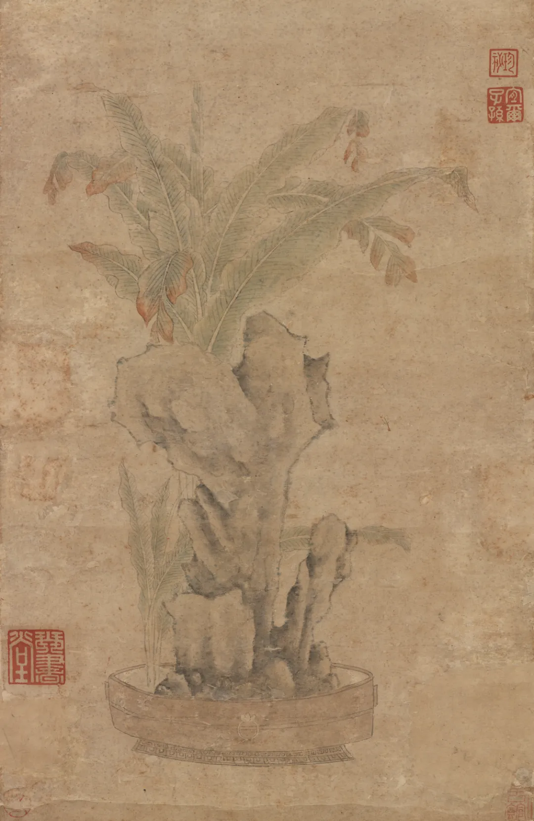 沈周此图,是“斋中供友”的绝佳写照。画中湖石与古洗同列案头——石以披麻皴写出,结构明晰、质感坚硬;古洗静置其侧,与石共作文房清供。石后芭蕉以大笔泼墨,疏朗错落。一石一洗、一刚一柔,正是文人书斋日常相伴之物。沈周自号“石田”,以无用之田自况,而这案头拳石与古洗,恰是“无用之用”的物化——它们不事生产,却滋养着主人的诗心。题诗“错认寻诗叶上书”点破玄机:在这蕉石之间、洗砚之余,藏着的正是文人超越功利、以虚待物的千古诗心。