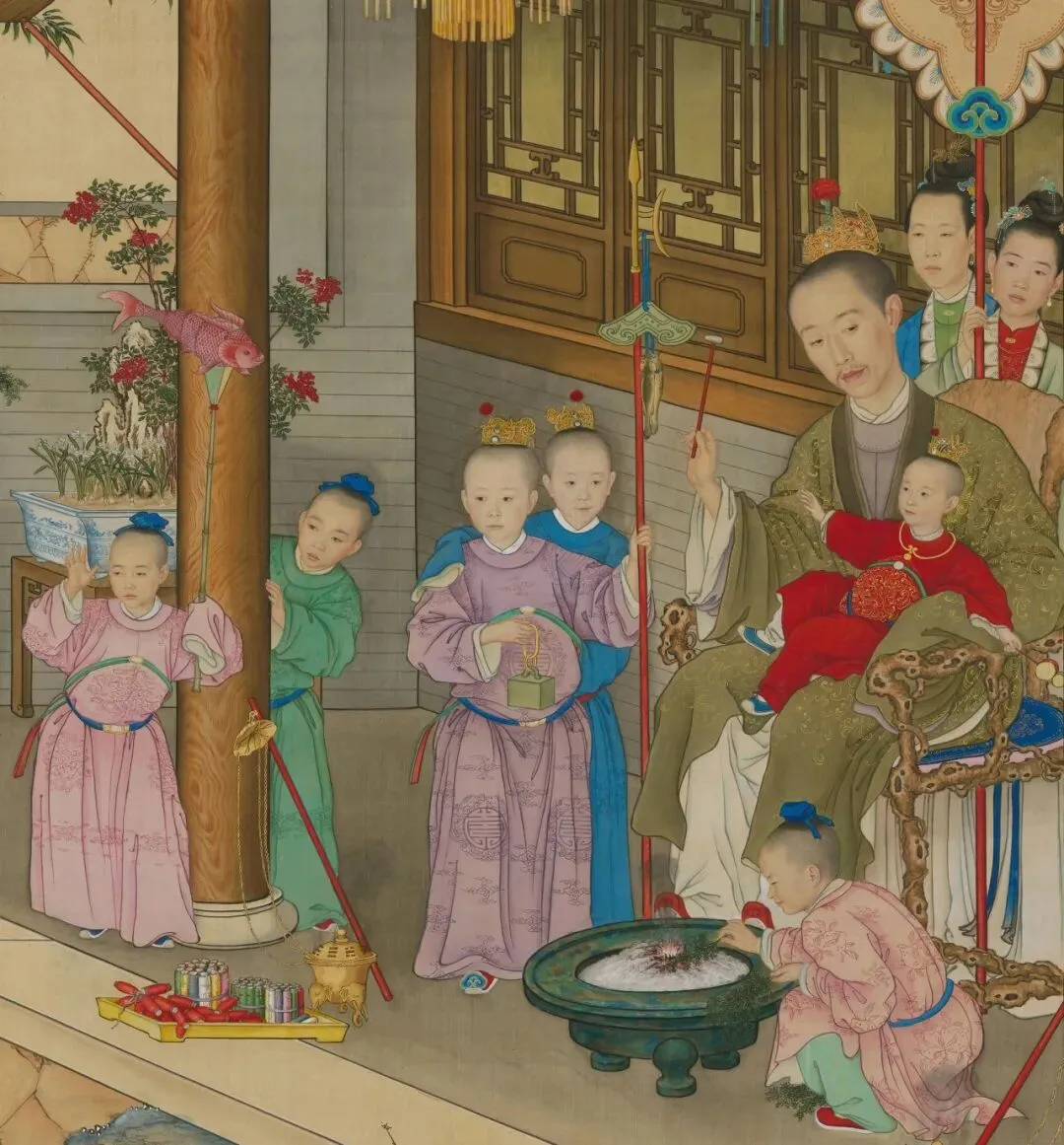 此图描绘了农历春节时,乾隆皇帝弘历父子尽享天伦之乐的情景。可以看到在廊柱的后面,花架上放着一盆赏石鲜花,赏石和鲜花搭配在一起也是明清时期常见的形态。石头旁边种着水仙花、南天竹,而在新年岁朝时,也会搭配其他名贵品种的花卉。