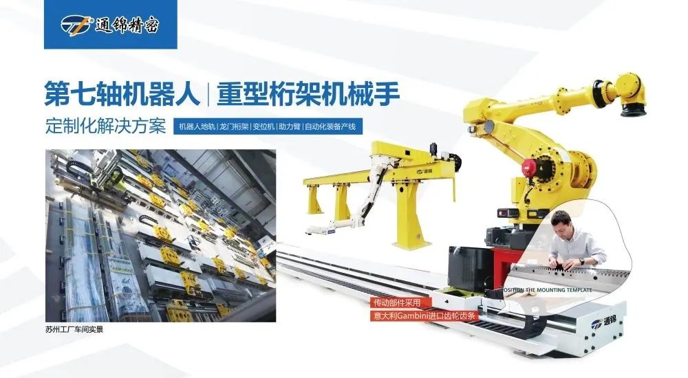 通锦专业生产各类第七轴机器人、桁架机械手、焊接变位机,具有重复定位精度高、响应速度快、运行平稳、安装可靠等特点,我们秉承为每一款机器人提供优质的行走轴整体解决方案,众多知名品牌、工程师、集成商指定的智能制造解决方案优秀服务商。