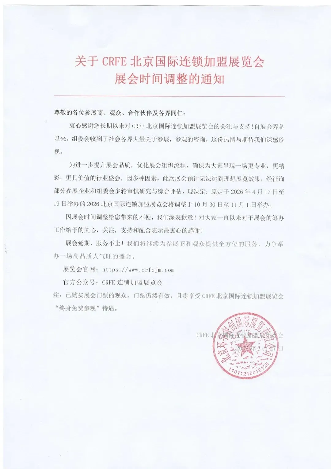 为进一步提升展会品质,优化展会组织流程,确保为大家呈现一场更专业,更精彩,更具价值的行业盛会,因多种因素,此次展会预计无法达到理想展览效果,经征询部分参展企业和组委会多轮审慎研究与综合评估,现决定:原定于2026年4月17日至19日举办的2026北京国际连锁加盟展览会将调整于10月30日至11月1日举办。